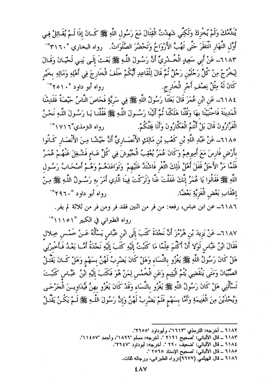 6187 - نجدة بن عامر الحروري: أنه كتب إلى ابن عباسٍ: هل كان رسول الله - صلى الله عليه وسلم - يغزو بالنساء؟ وهل كان يضرب لهم بسهمٍ؟ كان يقتل الصبيان؟ ومتى ينقضي يتم اليتيم؟ والخمس لمن هو؟ فقال ابن عباس: لولا أن أكتم علمًا ما كتبت إليه كتبت تسألني: هل كان رسول الله - صلى الله عليه وسلم - يغزو بالنساء؟ فقد كان يغزو بهنَّ فيداوين الجرحى، ويحذين من الغنيمة، وأما سهم فلم يضرب لهن، وإنه لم يكن يقتلُ