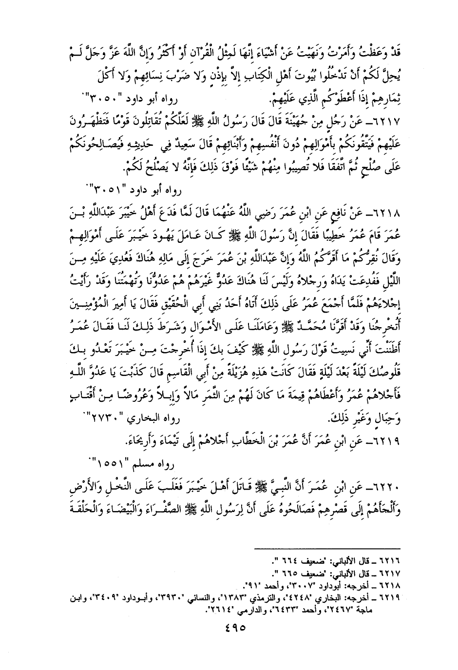 6217 - رجل من جهينة رفعه: ((لعلكم تقاتلون قومًا فتظهرون عليهم فيتقونكم بأموالهم دون أنفسهم وذراريهم فيصالحونكم على صلحٍ فلا تصيبوا منهم فوق ذلك فإنه لا يصلح لكم)). هما لأبي داود (¬1).