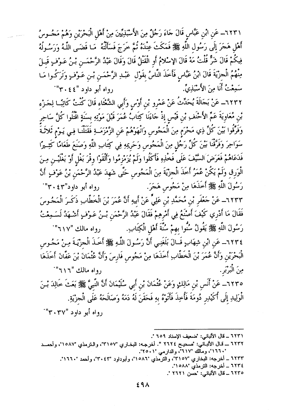 6233 - جعفر بن محمد، عن أبيه: أن عمر ذكر المجوس فقال: ما أدري كيف أصنع في أمرهم، فقال عبد الرحمن بن عوف: أشهد لسمعت النبي - صلى الله عليه وسلم - يقول: ((سنوا بهم سنة أهل الكتاب)) (¬1).