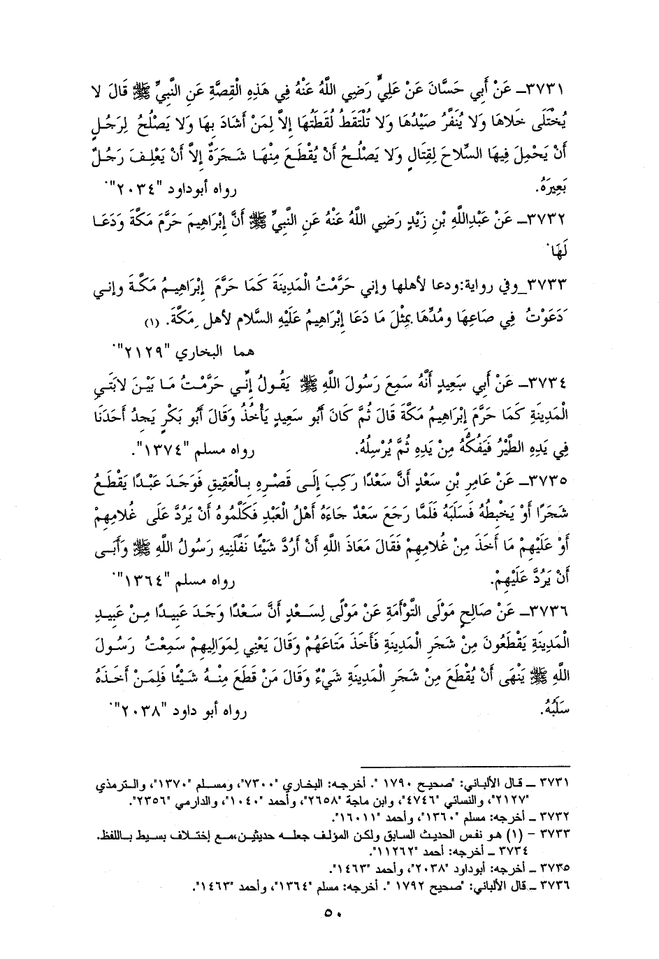 3734 - أبو سَعِيدٍ رفعه: ((إِنِّي حَرَّمْتُ مَا بَيْنَ لابَتَيِ الْمَدِينَةِ كَمَا حَرَّمَ إِبْرَاهِيمُ مَكَّةَ، وكَانَ أَبُو سَعِيدٍ يَجِدُ أَحَدَنَا وفِي يَدِهِ الطَّيْرُ فَيَفُكُّهُ مِنْ يَدِهِ ثُمَّ يُرْسِلُهُ)). لمسلم (¬1).