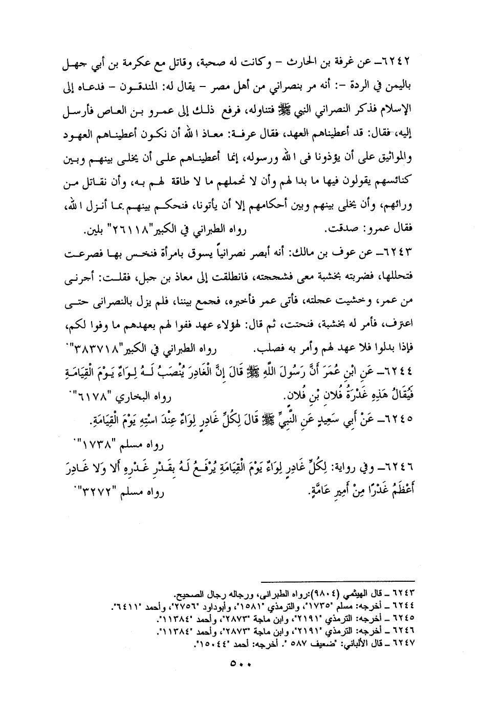 6242 - غرفة بن الحارث: أنه دعا إلى الإسلام نصرانيًا فذكر النصراني النبي - صلى الله عليه وسلم - فتناوله فرفع ذلك إلى عمرو بن العاص. فقال: قد أعطيناهم العهد، فقال عرفة: معاذ الله أن نكون أعطيناهم العهود والمواثيق على أن يؤذونا في الله ورسوله، إنما أعطيناهم على أن نخلي بينهم وبين كنائسهم يقولون فيها ما بدا لهم، وأن لا نحملهم ما لا طاقة لهم به وأن نقاتل من ورائهم وأن نخلي بينهم وبين أحكامهم إلا أن يأتونا فنحكم بينهم بما أنزل الله فقال عمروٌ صدقت. ((للكبير)) بلين (¬1).
