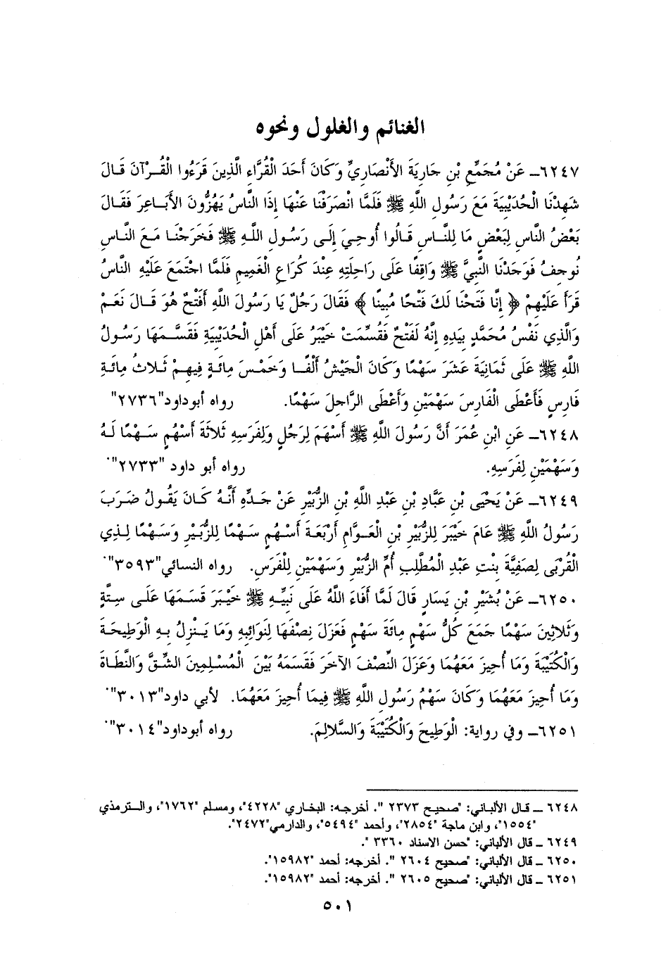 6249 - ابن الزبير: ضرب النبي - صلى الله عليه وسلم - عام خيبر للزبير أربعة أسهم سهم للزبير وسهم لذي القربي بصفية أمه وسهمان للفرس. للنسائي (¬1).