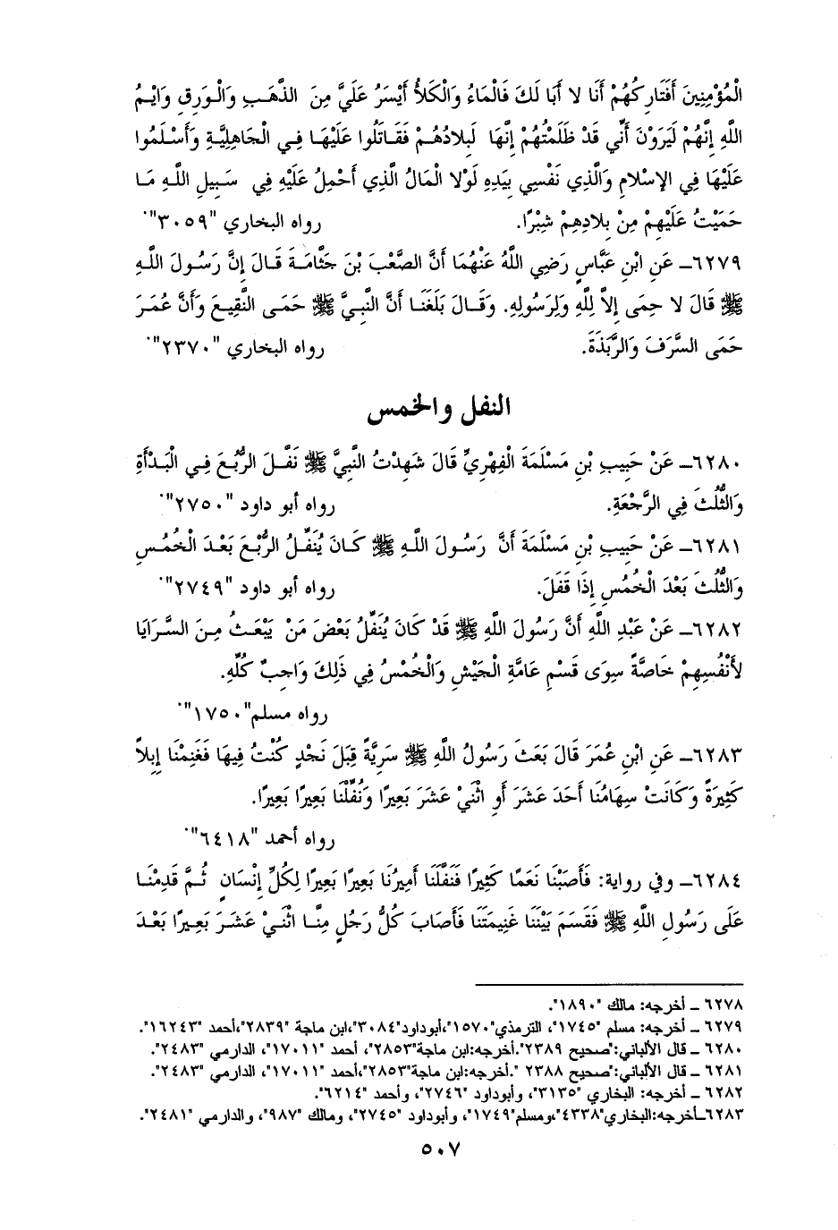 6282 - ابن عمر: أن النبي - صلى الله عليه وسلم - كان ينفل بعض من يبعث من السرايا لأنفسهم خاصةً سوى قسم عامة الجيش والخمس في ذلك كلِّه واجبٌ (¬1).