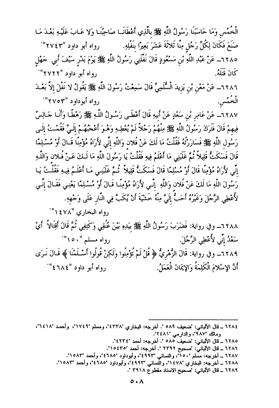 6289 - وفي أخرى: قال الزهريّ: فنرى أن الإسلام الكلمة، والإيمان العمل الصالح. للشيخين وأبي داود والنسائي (¬1).