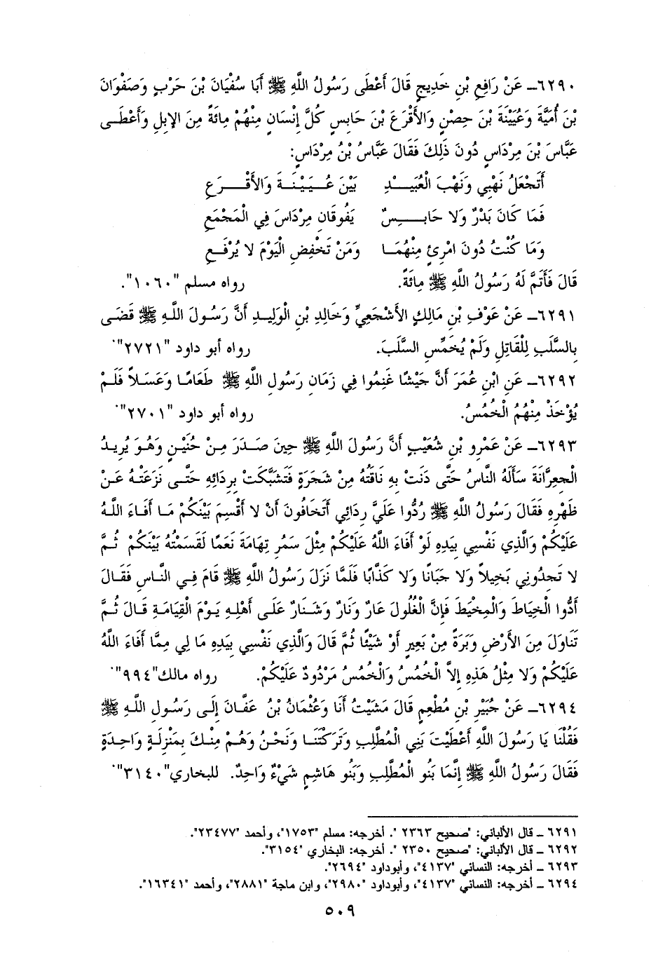 6290 - رافع بن خديج: أعطى النبي - صلى الله عليه وسلم - أبا سفيان بن حربٍ يوم حنين، وصفوان بن أمية، وعيينة بن حصن، والأقرع بن حابسٍ، وعلقمة بن علاثة كل إنسان منهم مائةً من الإبل، وأعطى عباس بن مرداسٍ دون ذلك، فقال عباسٌ:
