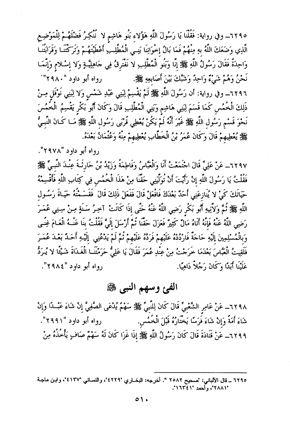 6296 - وفي أخرى: أنه - صلى الله عليه وسلم - لم يكن يقسم لبني عبد شمس ولا لبنى نوفل من الخمس شيئًا كما قسم لبنى هاشم وبني المطلب، وكان أبو بكرٍ يقسمُ الخمس نحو قسمه - صلى الله عليه وسلم -، غير أنه لم يكن يعطى منه قرباء النبي - صلى الله عليه وسلم - يعطيهم رسول الله - صلى الله عليه وسلم -، كان عمر يعطيهم ومن كان بعده منه. للبخاري وأبي داود والنسائي (¬1).