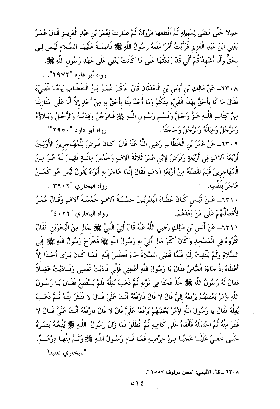 6308 - عمر: ما أنا أحق بهذا الفيء منكم، وما أحد منَّا أحق به من أحد إلا أنا على منازلنا من كتاب الله، وقسمة رسوله: فالرجل وقدمه، والرجل وبلاؤه، والرجل وعياله، والرجل وحاجته. هما لأبي داود (¬1).