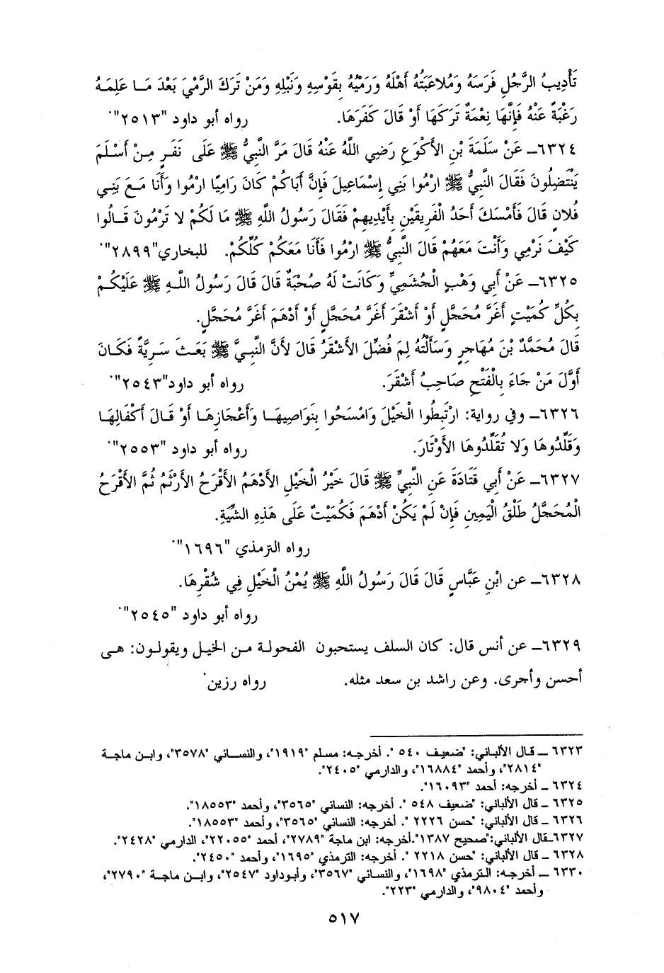6329 - أنس: كان السلف يستحبون الفحولة من الخيل ويقولون هي أحسن وأجرى وعن راشد بن سعدٍ مثله. لرزين.