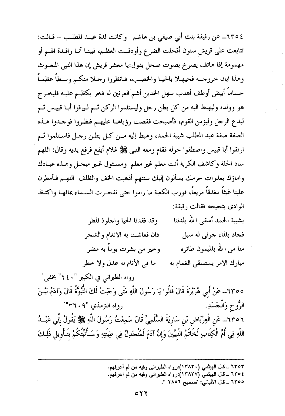 6354 - رقيقة بنت أبي صيفي: وكانت لدة عبد المطلب قالت: تتابعت على قريشٍ سنون أقحلت الضرع وأدقت العظم فبينا أنا راقدة سمعت قائلًا يقول يا معشر قريشٍ إن هذا النبيَّ المبعوث وهذا أبان خروجه فحيهلا بالحيا لخصب فانظروا رجلاً منكم وسيطًا عظامًا جسامًا أبيض أو طف أهدب سهل الخدين أشمَّ العرنين، له فخرٌ يكظم عليه فليخرج هو وولده وليهبط إليه من كلِّ بطن رجلٌ، وليستملوا الركن، ثم ليرقوا أبا قبيس ثم ليدعُ الرجلُ وليؤمن القوم فأصبحتُ فقصصت رؤياها عليهم فنظروا فوجدوا هذه الصفة صفة عبد المطلب الحمد وهبط إليه من كل بطنٍ رجلٌ فاستلموا ثم ارتقوا أبا قبيس، واصطفوا حوله فقام ومعه النبي - صلى الله عليه وسلم - غلامٌ أيفع فرفع يديه وقال: اللهم ساد الخلة، وكاشف الكربة، أمت معلِّم غير معلًَّم، ومسئول غير مبخلٍ، وهذه عبادك وإماؤك بعذرات حرمك يسألون إليك، سنتهم أذهبت الخف والظلف، اللهم فأمطرن علينا غيثًا مغدقًا مربعًا، فوربِّ الكعبة ما راموا حتى تفجرت السماء بمائها واكتظَّ الوادي بثجيجه فقالت رقيقة: