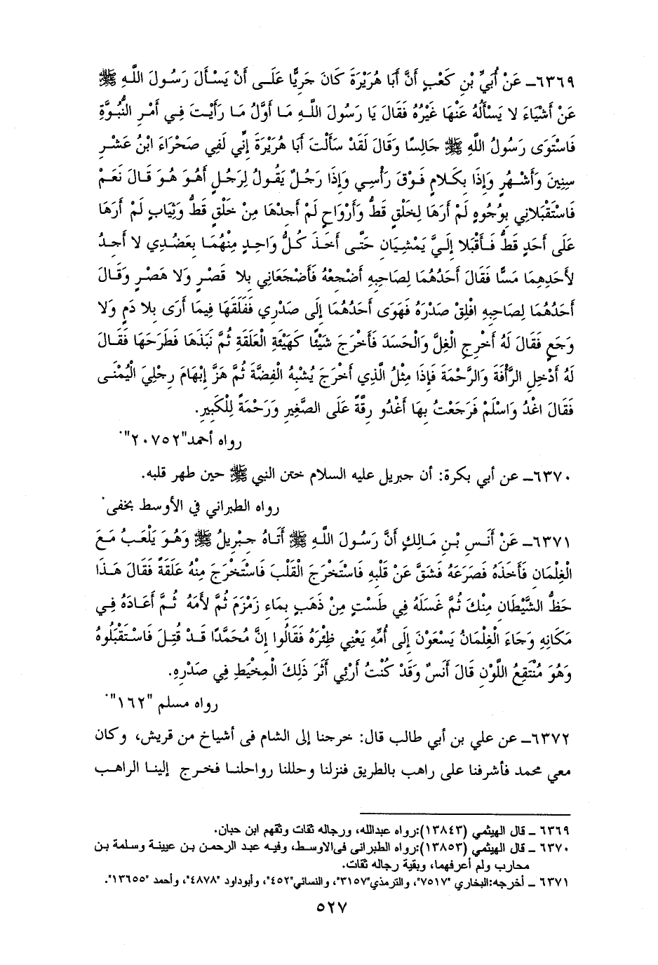 6369 - أبى بن كعبٍ: أن أبا هريرة قال: يا رسول الله ما أول ما رأيت من أمر النبوة؟ فقال: ((إني لفي صحراء ابن عشر سنين وأشهرٍ، وإذا بكلامٍ فوق رأسي، وإذا برجلٍ يقول لرجلٍ: أهو هو؟ قال: نعم فاستقبلاني بوجوهٍ لم أرها لخلقٍ قط، وأرواحٍ لم أجدها من خلقٍ قط، وثيابٍ لم أرها على أحدٍ قط، فأقبلا إلى يمشيان حتى أخذ كل واحدٍ منهما بعضدي لا أجد لأخذهما مسًا، فقال أحدهما لصاحبه: أضجعه أضجعه، فأضجعاني بلا قصرٍ ولا هصرٍ، فقال أحدهما لصاحبه: افلق صدره، فهوى أحدهما إلى صدري، ففلقها فيما أرى بلا دمٍ ولا وجعٍ، فقال له: أخرج الغل والحسد، فأخرج شيئًا كهيئة العلقة ثم نبذها فطرحها، فقال له: ... ادخل الرحمة والرأفة، فإذا مثل الذي أخرج شبيه الفضة، ثم هز إبهام رجلي اليمنى فقال: اغد واسلم، فرجعت لها أغدو بها رأفةً على الصغير ورحمةً)). للكبير. لابن أحمد (¬1).