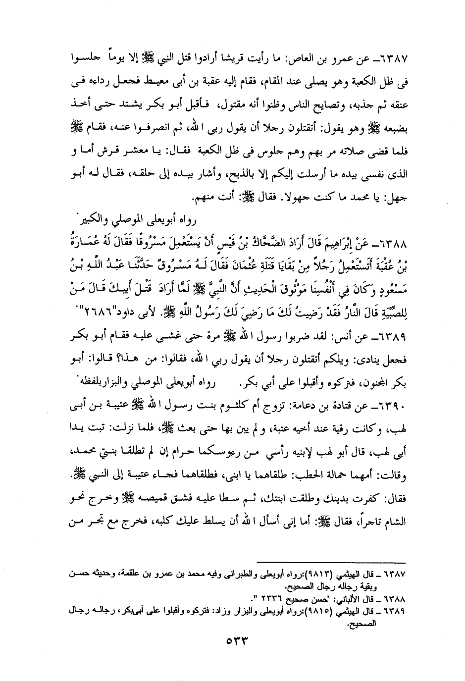 6387 - عمرو بن العاص: ما رأيت قريشًا أرادوا قتل النبي - صلى الله عليه وسلم - إلا يومًا جلسوا في ظلِّ الكعبة وهو يصلي عند المقام، فقام إليه عقبة ابن أبي معيطٍ، فجعل رداءه في عنقه، ثم جذبه وتصايح الناس، وظنوا أنه مقتولٌ فأقبل أبو بكرٍ يشتدُ، حتى أخذ بضبعه - صلى الله عليه وسلم -، وهو يقول: أتقتلون رجلاً أن يقول ربيَ الله، ثم انصرفوا عنه، فقام - صلى الله عليه وسلم -، فلمَّا قضى صلاته مرَّ بهم وهم جلوسٌ في ظلِ الكعبة، فقال: ((يا معشر قريشٍ، أما والذي نفسي بيده ما أرسلت إليكم إلا بالذبح، وأشار بيده إلى حلقه))، فقال له أبو جهل: يا محمد ما كنت جهولاً، فقال - صلى الله عليه وسلم -: ((أنت منهم)). للموصلى والكبير (¬1).