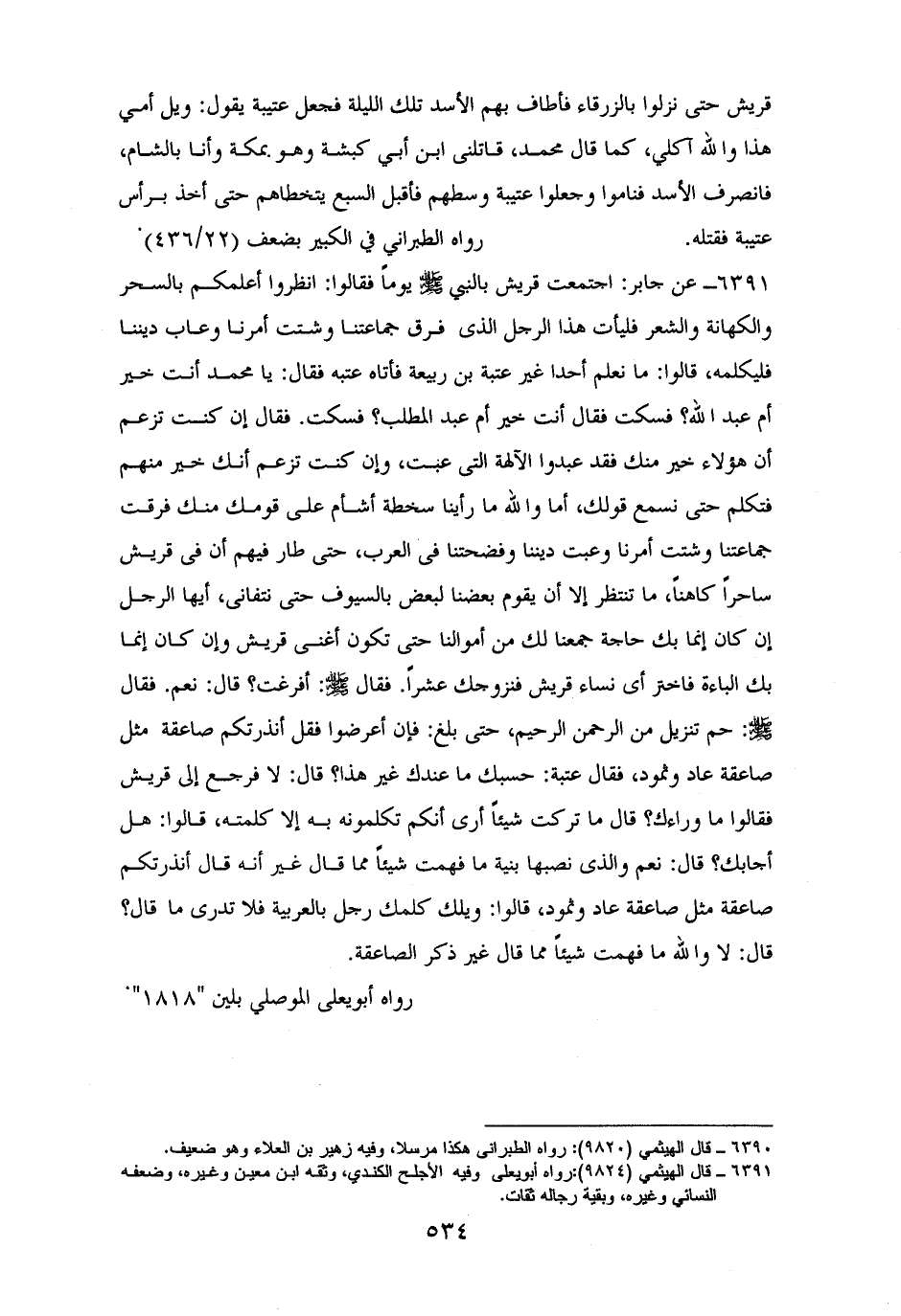 6391 - جابر: اجتمعت قريشُ بالنبيِّ - صلى الله عليه وسلم - يومًا فقالوا: انظروا أعلمكم بالسحر والكهانة والشعر، فليأت هذا الرجل الذي فرَّق جماعتنا، وشتت أمرنا، وعاب ديننا، فليكلمه، قالوا: ما نعلمُ أحدًا غير عتبة بن ربيعة، فأتاه عتبة، فقال: يا محمد أنت خيرٌ أم عبد الله؟
