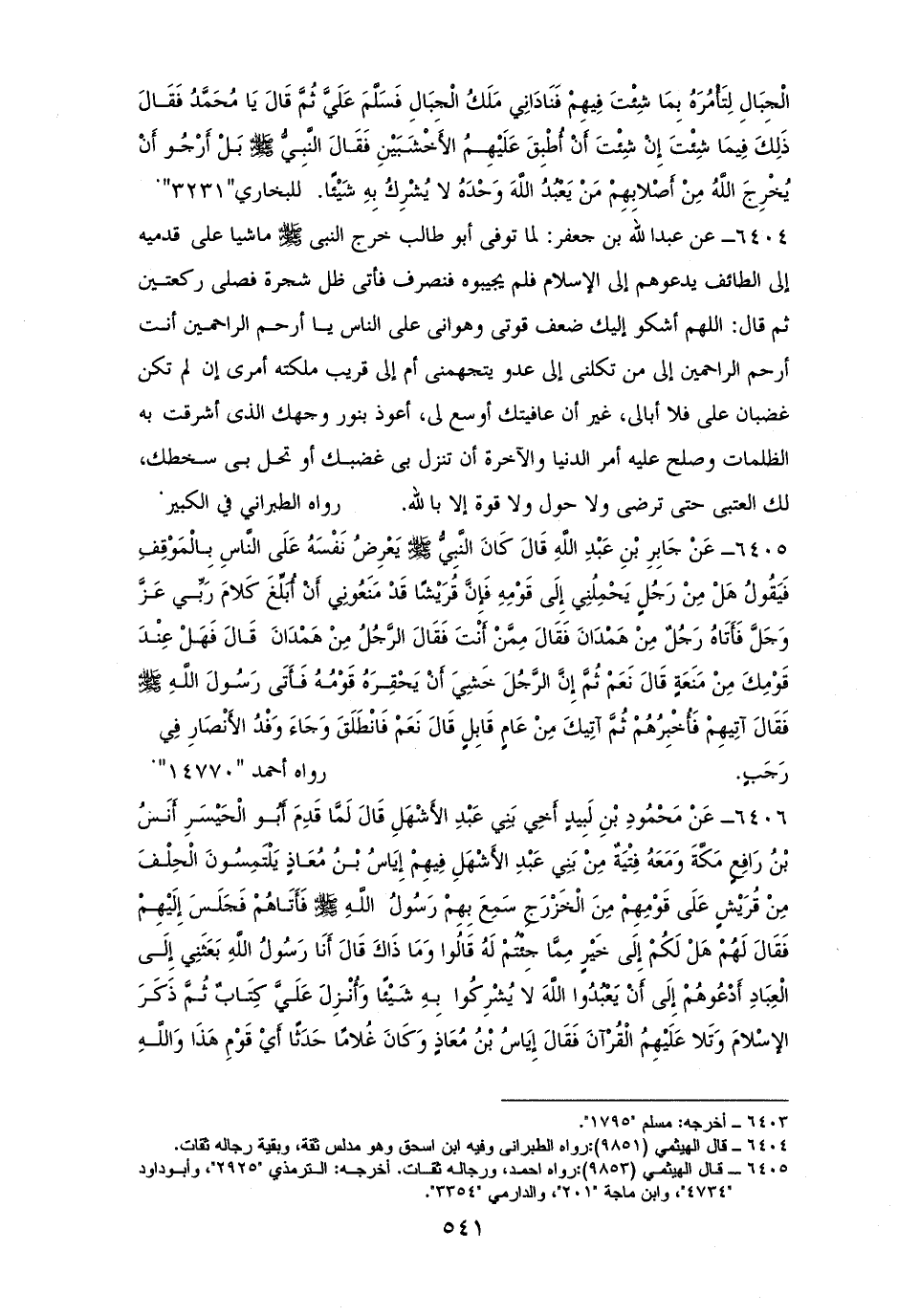 6404 - عبد الله بن جعفر: لما توفى أبو طالبٍ خرج النبيُّ - صلى الله عليه وسلم - ماشيًا على قدميه إلى الطائف يدعوهم إلى الإسلام فلم يجيبوه، فانصرف فأتى ظل شجرةٍ فصلى ركعتين، ثم قال: ((اللهم أشكو إليك ضعف قوتي وهواني على الناس، يا أرحم الراحمين أنت أرحم الراحمين، إلى من تكلني؟ إلى عدو يتجهمني، أم إلى قريبٍ ملكته أمري، إن لم تكن غضبان على فلا أبالي، غير أن عافيتك أوسع لي، أعوذ بنور وجهك الذي أشرقت به الظلمات، وصلح عليه أمر الدنيا والآخرة، أن تنزل بي غضبك أو تُحل بي سخطك، لك العتبى حتى ترضى، ولا حول ولا قوة إلا بالله)). للكبير (¬1).