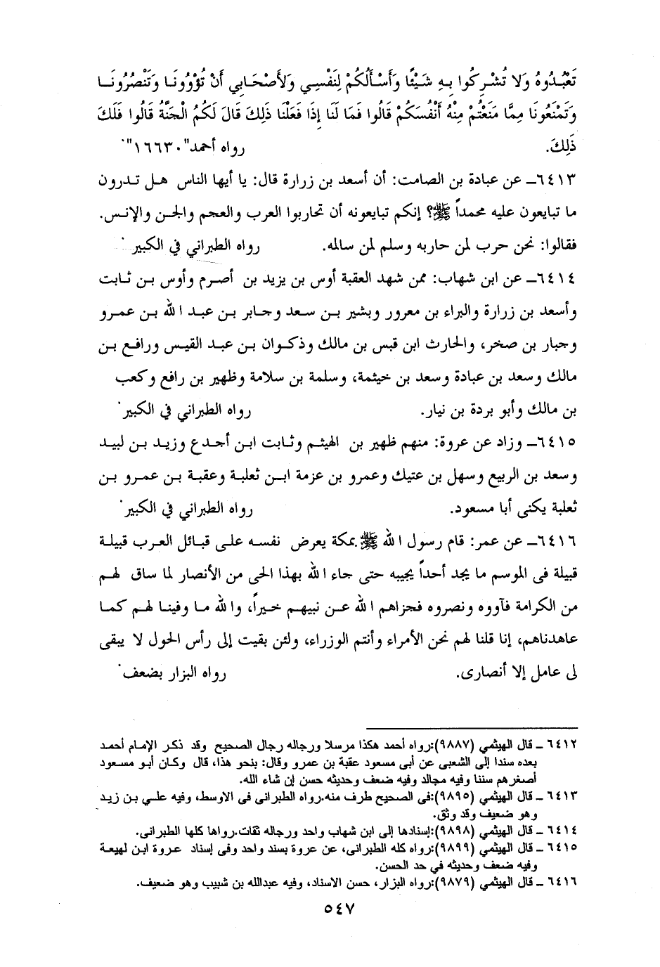6413 - وللكبير عن عبادة بن الصامت: أنَّ أسعد بن زرارة قال: يا أيها الناسُ هل تدرون ما تبايعون عليه محمدًا - صلى الله عليه وسلم -؟ إنكم تبايعونه أن تُحاربوا العرب والعجم والجن والإنس، فقالوا: نحن حربٌ لمن حاربه وسلمٌ لمن سالمهُ (¬1).