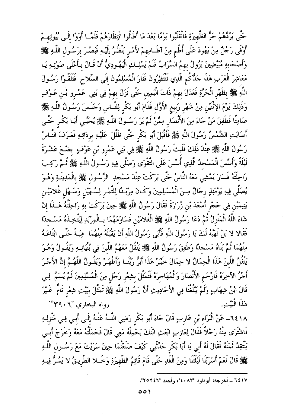 6418 - البراء بن عازب: جاء أبو بكر إلى أبي في منزله فاشترى منه رحلاً، فقال لعازبٍ: ابعث معي ابنك يحمله، فحملته، وخرج أبي معه ينتقد ثمنه فقال له: يا أبا بكرٍ كيف صنعتما ليلة سريت مع النبي - صلى الله عليه وسلم -؟