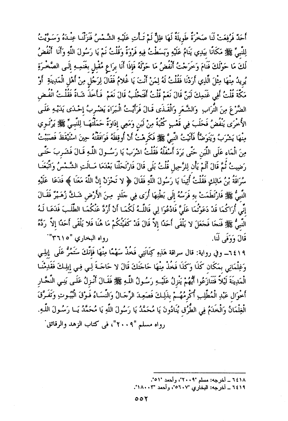 6419 - وفي رواية: قال سراقة: هذه كنانتي فخذ سهمًا منها فإنك ستمر على إبلي وغلماني بمكان كذا وكذا فخذ منها حاجتك، قال: ((لا حاجة لي)) فقدمنا المدينة ليلاً تنازعوا أيهم ينزل عليه، فقال: ((أنزل على بني النجار أخوال بني عبد المطلب أكرمهم بذلك))، فصعد الرجال والنساء فوق البيوت، وتفرق الغلمانُ والخدم في الطريق ينادون يا محمد يا رسول الله. للشيخين (¬1).
