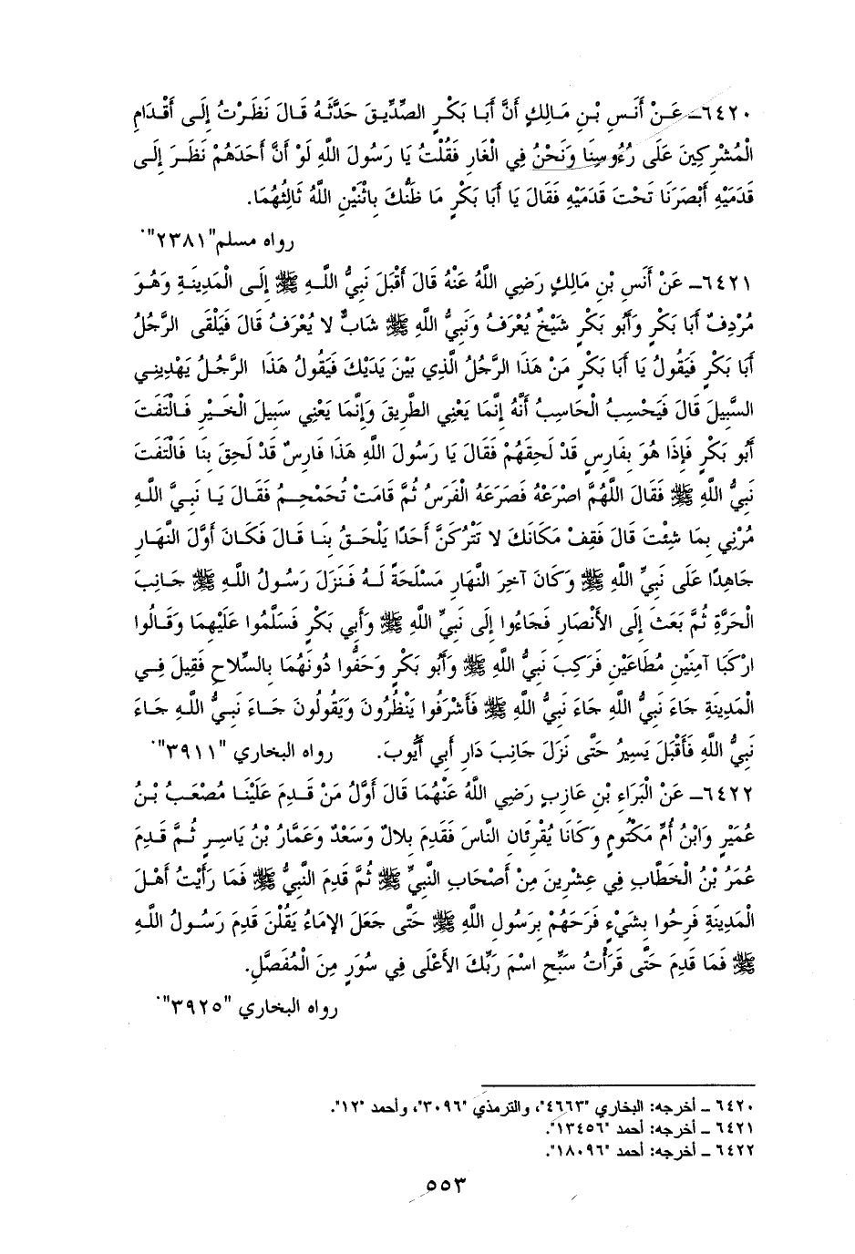 6420 - أبو بكر: نظرت إلى أقدام المشركين ونحن في الغار وهم على رءوسنا، فقلت: يا رسول الله لو أنَّ أحدهم (نظر) (¬1) إلى قدميه أبصرنا تحت قدميه فقال: ((يا أبا بكرٍ ما ظنك باثنين الله ثالثهما)). للشيخين والترمذي (¬2).