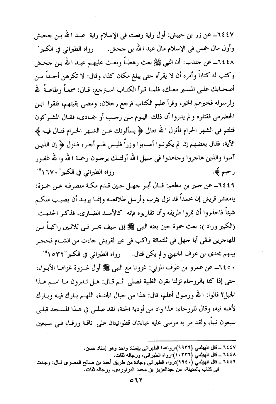 6447 - زرُّ بن حبيشٍ: أول رايةٍ رفعت في الإسلام راية عبد الله بن جحشٍ، وأول مال خمِّس في الإسلام مال عبد الله بن جحشٍ. للكبير (¬1).