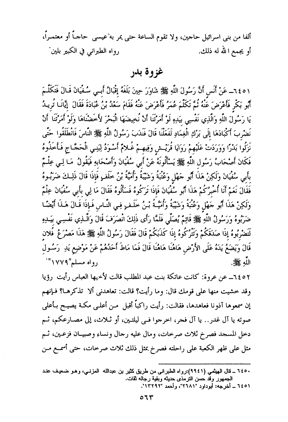 6451 - أنسٌ: أنَ النبيَّ - صلى الله عليه وسلم - شاور حين بلغه إقبالُ أبي سفيان، فتكلم أبو بكرٍ، فأعرض عنه، ثم تكلم عمر، فأعرض عنه، فقام سعد ابن عبادة، فقال: إيانا تريدُ يا رسول الله؟ والذي نفسي بيده لو أمرتنا أن نخيضها البحر لأخضناها، ولو أمرتنا أن نضرب أكبادها إلى برك الغماد لفعلنا، فندب - صلى الله عليه وسلم - الناس فانطلقوا حتى نزلوا بدرًا، ووردت عليهم روايًا قريش وفيهم غلامٌ أسود فأخذه أصحابه - صلى الله عليه وسلم - يسألونه عن أبي سفيان وأصحابه، فيقول: ما لي علمٌ بأبي سفيان، ولكن هذا أبو جهلٍ وعتبة وشيبة وأمية بن خلفٍ. فإذا قال ذلك ضربوه، فقال: نعم، أنا أخبركم هذا أبو سفيان. فإذا تركوه فسألوه، قال ما لي بأبي سفيان علمٌ، ولكن هذا أبو جهل وعتبة وشيبة وأمية بن خلفٍ في الناس. فإذا قال هذا أيضًا ضربوه، ورسول الله - صلى الله عليه وسلم - قائمٌ يصلي، فلمَّا رأى ذلك انصرف، وقال: ((والذي نفسي بيده لتضربونه إذا صدقكم، وتتركونهُ إذا كذبكم، هذا مصرع فلانٍ، ويضع يده على الأرض ههنا وههنا))، فما ماط أحدٌ عن موضع يده. لأبي داود ومسلمٍ بلفظه (¬1).
