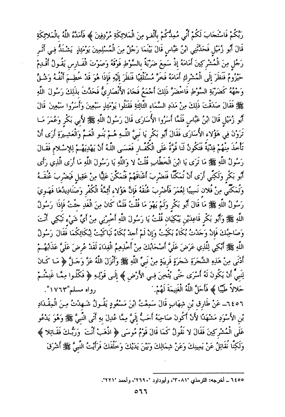 6456 - ابنُ مسعودٍ: شهدتُ من المقداد بن الأسود مشهدًا لأن أكون أنا صاحبهُ أحب إلىَّ مما عدل به، أتى النبيَّ - صلى الله عليه وسلم - وهو يدعو على المشركين يوم بدرٍ، فقال: يا رسول الله، إنَّا لا نقول كما قالت بنو إسرائيل لموسى {اذْهَبْ أَنْتَ وَرَبُّكَ فَقَاتِلا إِنَّا هَاهُنَا قَاعِدُونَ} [المائدة: 24] ولكنا نقاتل عن يمينك وعن شمالك وبين يديك وخلفك، فرأيتُ النبيَّ - صلى الله عليه وسلم - أشرق
