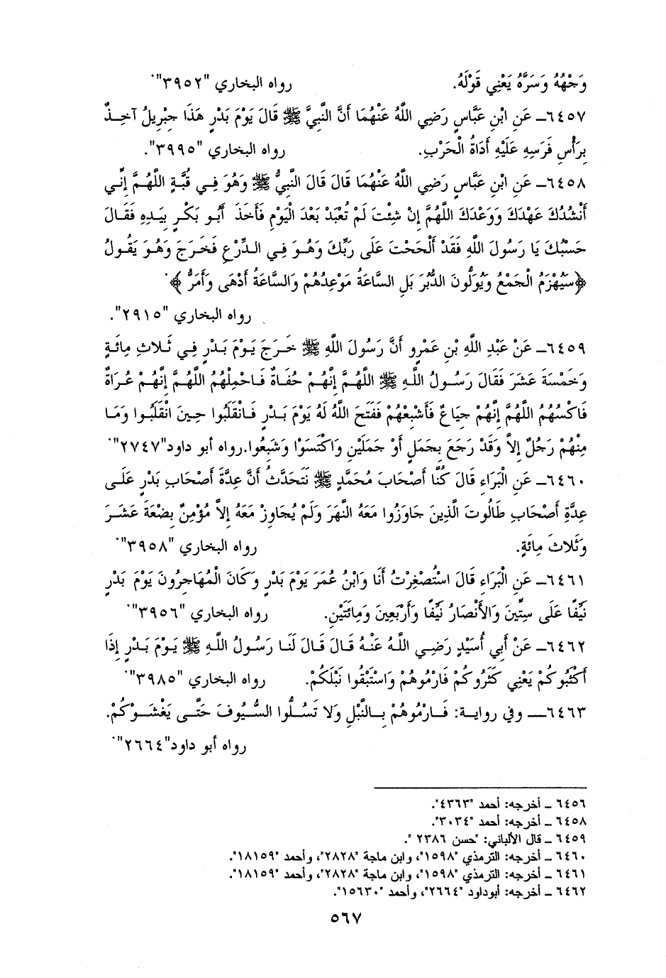 6461 - وله: استصغرتُ أنا وابن عمرٍ يوم بدرٍ وكان المهاجرون يوم بدر نيفًا على الستين، والأنصارُ نيفًا وأربعين ومائتين. للبخاري (¬1).