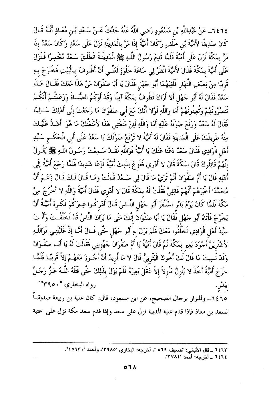 6464 - سعدُ بن معاذ: أنه كان صديقًا لأمية بن خلفٍ، وكان أمية إذا مرَّ بالمدينة نزل على سعدٍ، وكان سعدٌ إذا مرَّ بمكة نزل على أمية، فانطلق سعدٌ معتمرًا، فنزل على أمية، وقال له: انظر لي ساعة خلوةٍ لعلي أن أطوف بالبيت، فخرج به قريبًا من نصف النهار فلقيهما أبو جهلٍ، فقال: يا أبا صفوان من هذا معك؟ فقال: هذا سعدٌ، فقال له: أبو جهلٍ: ألا أراك تطوف بمكة آمنًا وقد آويتم الصباة وزعمتم أنكم تنصرونهم وتعينونهم؟ أما والله لولا أنك مع أبي صفوان ما رجعت إلى أهلك سالمًا. فقال له سعدٌ ورفع صوته عليه: أما والله لئن منعتني هذا لأمنعنك ما هو أشدُ عليك منه، طريقك على المدينة، فقال له أميةُ: لا ترفع صوتك يا سعد على أبي الحكم سيد أهل الوادي. فقال سعد: دعنا عنك يا أمية، فوالله لقد سمعتُ رسول الله - صلى الله عليه وسلم - يقولُ: ((إنه قاتلك)). قال: بمكة؟