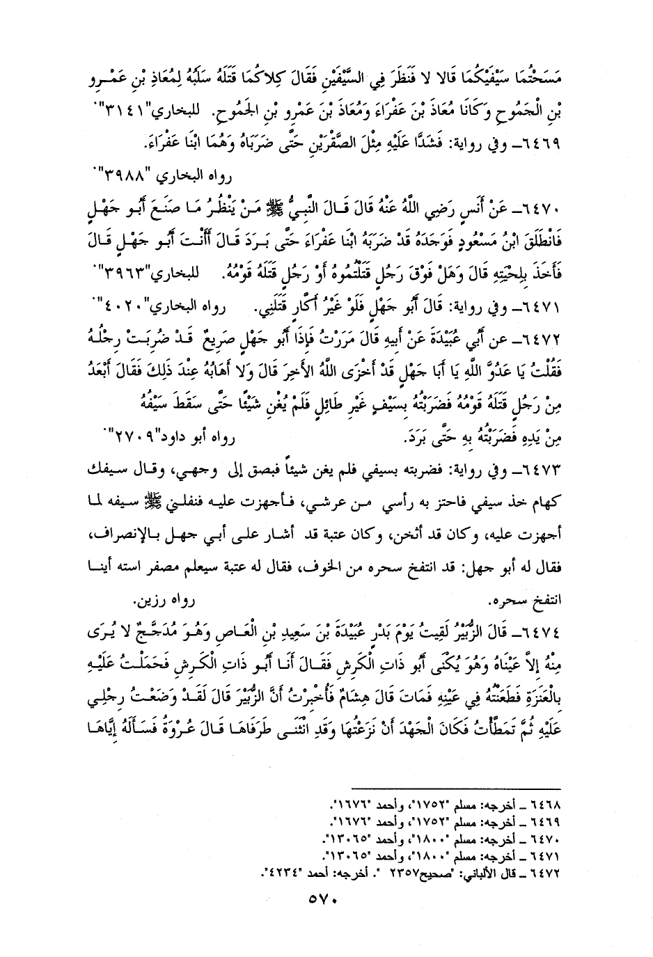 6472 - ابنُ مسعودٍ: مررت فإذا أبو جهلٍ صريعٌ قد ضربت رجله، فقلت: يا عدو الله يا أبا جهلٍ قد أخزى الله الآخر، ولا أهابه عند ذلك، فقال: أبعد من رجلٍ قتله قومهُ، فضربتهُ بسيفٍ غير طائلٍ، فلم يغن شيئًا حتى سقط سيفه من يديه، فضربته حتى برد. لأبى داود (¬1).