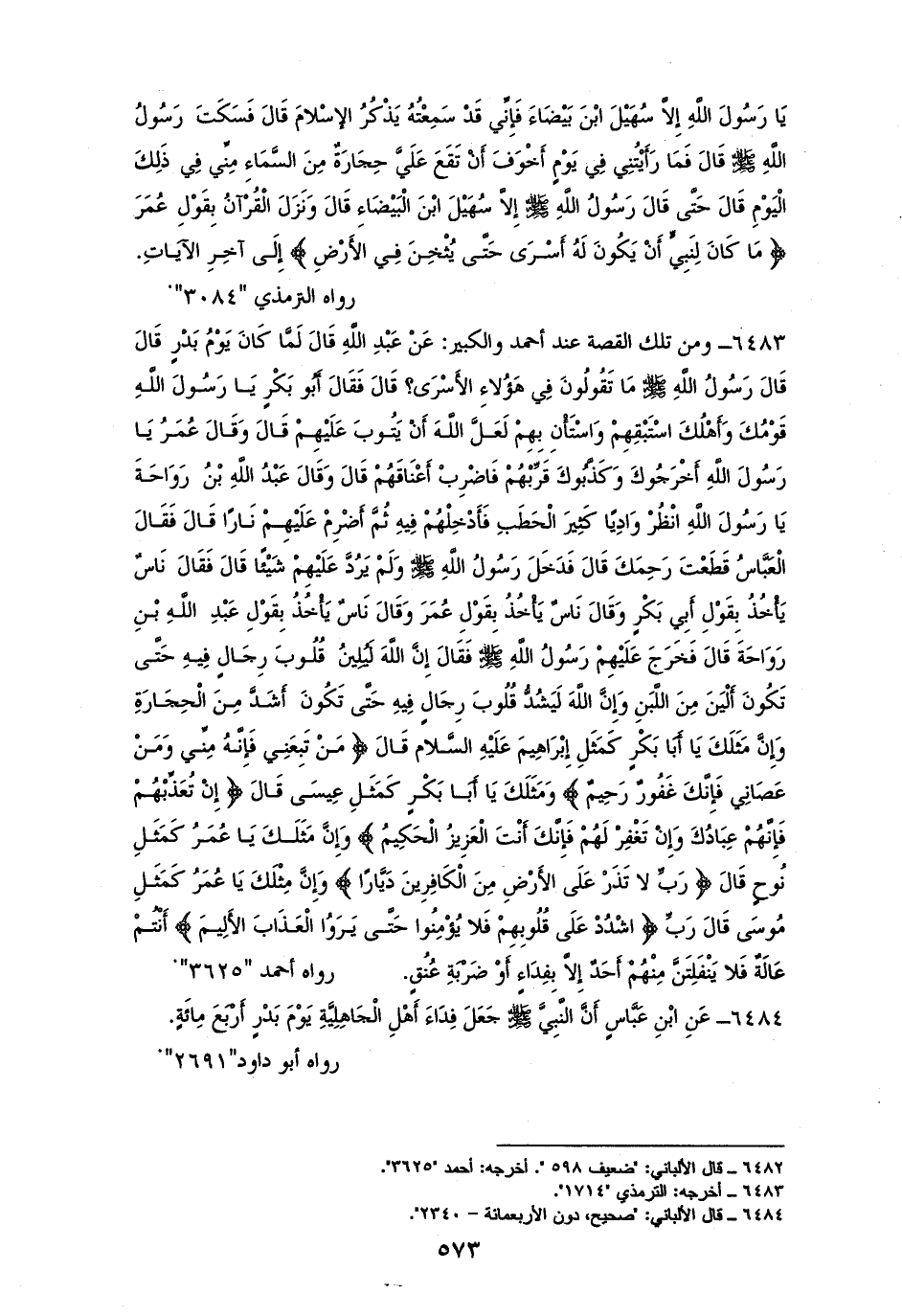 6483 - ومن تلك القصة عند أحمد والكبير: أنه - صلى الله عليه وسلم - قال: ((ما تقولون في هؤلاء الأسارى))؟