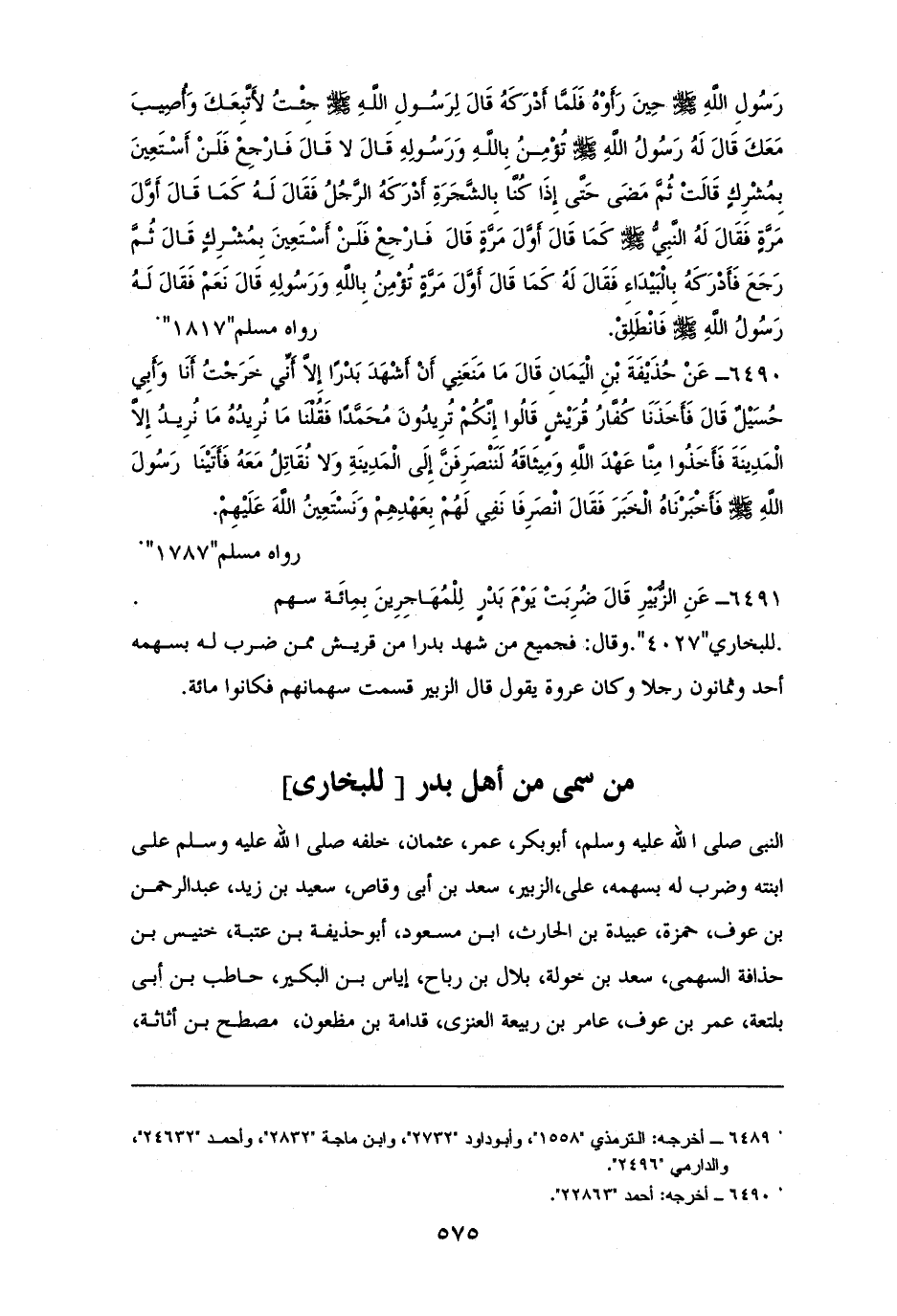 6491 - الزبيرُ: ضربتُ يوم بدرٍ للمهاجرين بمائة سهم. للبخاري.