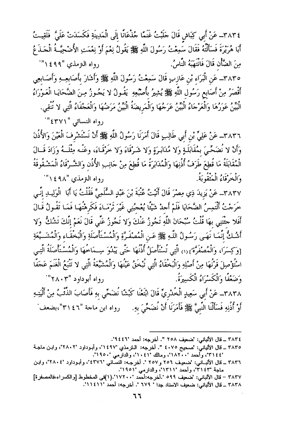 3835 - الْبَرَاءُ رفعه: ((لا تضحى بالعرجاء بين ضلوعها، ولا العوراء بين عورها، ولا بالمريضة بين مرضها، ولا بالعجفاء التي لا تنقى)). لمالك وأصحاب السنن (¬1).