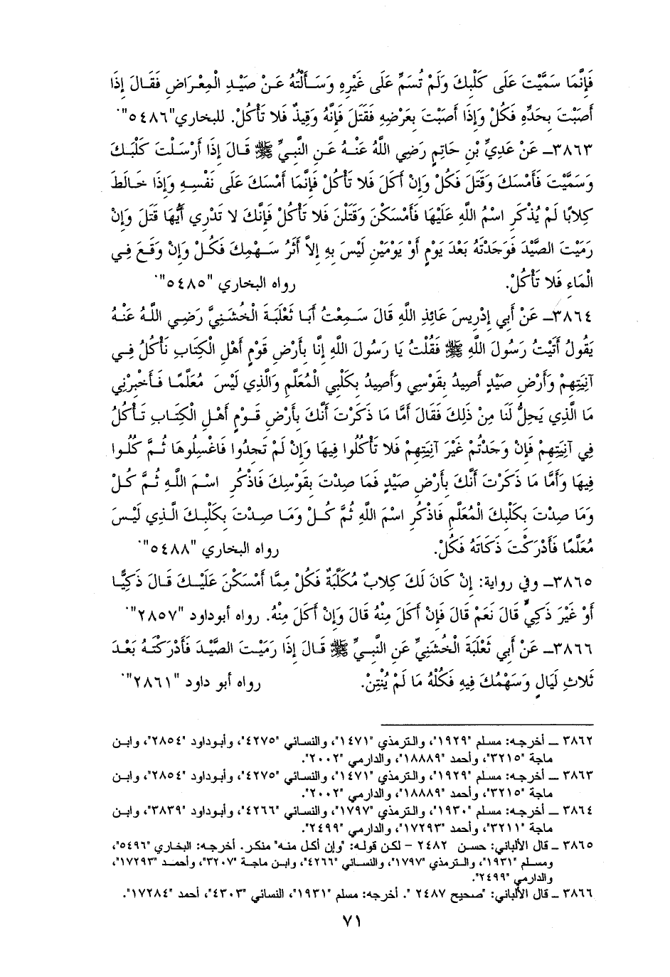 3864 - أبو ثعلبة الخشني قلت: ((يا رسول الله إني أصيد بكلبي المعلم وبكلبي الذي ليس معلمًا فقال: ما صدت بكلبك المعلم فاذكر اسم الله وكل وما صدت بكلبك الذي ليس بمعلم فأدركت ذكاته فكل)) (¬1).