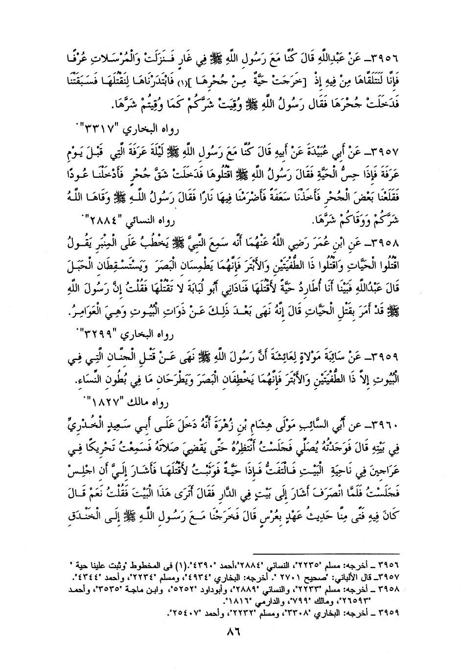 3957 - وفي رواية: كُنَّا مَعَ النبي - صلى الله عليه وسلم - لَيْلَةَ عَرَفَةَ فَإِذَا حِسُّ الْحَيَّةِ، فَقَالَ: ((اقْتُلُوهَا)) فَدَخَلَتْ شَقَّ جُحْرٍ فَأَدْخَلْنَا عُودًا، فَقَلَعْنَا بَعْضَ الْجُحْرِ، وأَخَذْنَا سَعَفَةً وأَضْرَمْنَا فِيهَا نَارًا، فَقَالَ - صلى الله عليه وسلم -: ((وَقَاهَا الله شَرَّكُمْ وَوَقَاكُمْ شَرَّهَا)). للشيخين والنسائي (¬1).
