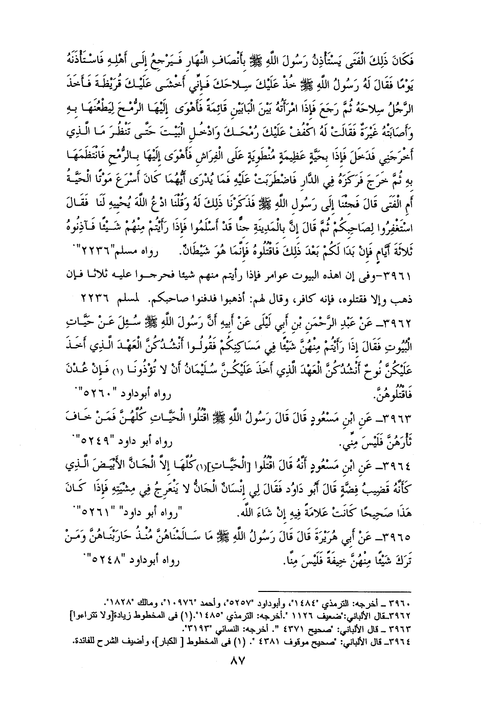 3963 - ابْنُ مَسْعُودٍ [رفعه]: ((اقْتُلُوا الْحَيَّاتِ كُلَّهُنَّ، فَمَنْ خَافَ ثَأْرَهُنَّ فَلَيْسَ مِنِّي)) (¬1).