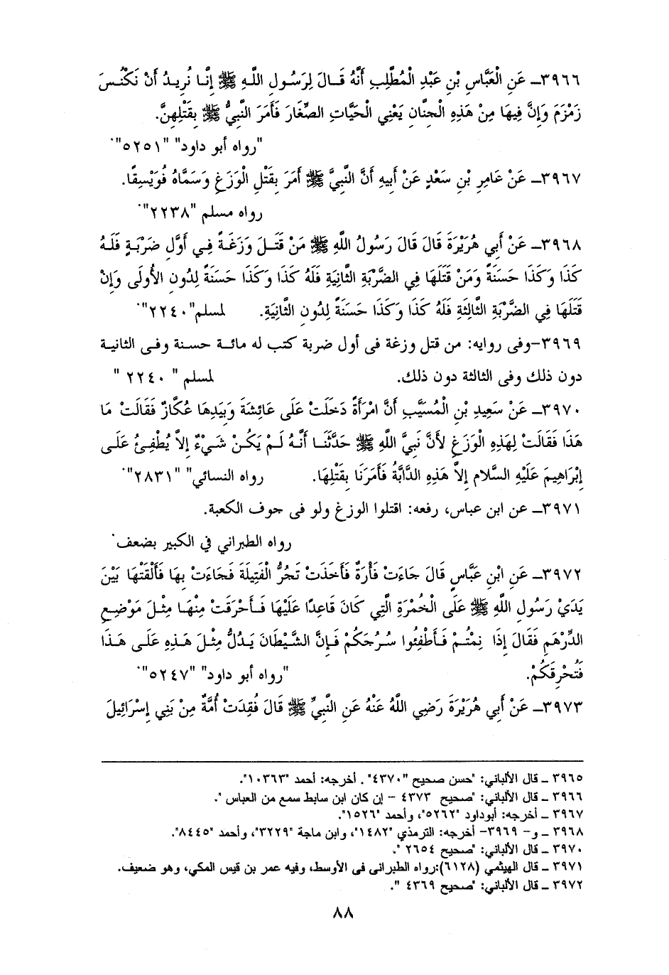3969 - وفي روايه: ((من قتل وزغًا في أول ضربة كتب الله له مائة حسنة، وفى الثانية دون ذلك، وفى الثالثة دون ذلك)). لمسلم وأبي داود والترمذي (¬1).