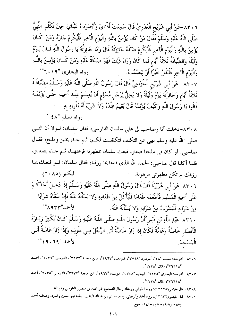 8306 - أبو شريح العدوي: سمعت أذناي وأبصرت عيناي ووعاه قلبي، حين تكلَّم به النبيُّ فقال: ((من كان يؤمنُ بالله واليومِ الآخرِ فليكرمْ ضيفه جائزته))، قالوا: وما جائزتُه يا رسولَ الله؟ قال: ((يومُه وليلتُه، والضيافةُ ثلاثةُ أيامٍ، فما كان وراءَ ذلك فهو صدقةٌ عليه، ومن كان يؤمنُ بالله واليومِ الآخر فليقلْ خيرًا أو ليصمتْ)) (¬1).