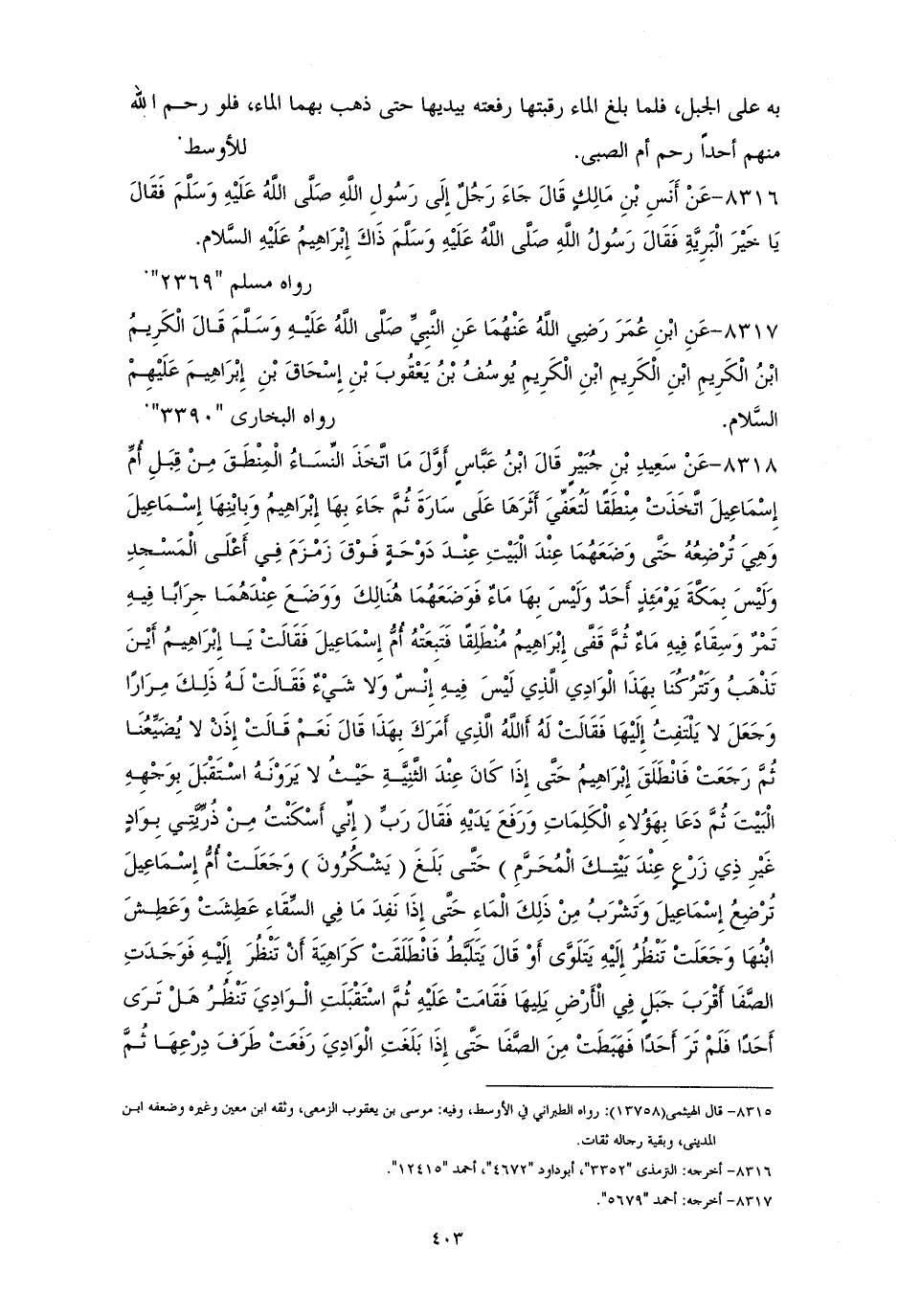 8318 - ابن عباس: رفعه: ((أول ما اتخذت النساءُ المنطق من قبلُ أمُّ إسماعيلَ، اتخذتْ منطقًا لتعفى أثرها على سارةَ، ثم جاء بها إبراهيمُ وبابنها إسماعيلَ وهي تُرضعهُ حتَّى وضعهما عند البيتِ عندَ دوحةٍ فوق زمزمَ في أعلى المسجدِ، وليس بمكةَ يومئذٍ أحدٌ وليس بها ماءٌ، فوضعهما هناك ووضع عندهما جرابًا فيه تمرٌ وسقاءً فيه ماءٌ، ثم قفى إبراهيم منطلقًا، فتبعته أمُّ إسماعيلَ فقالت: يا إبراهيمُ، أين تذهب وتتركنا بهذا الوادي الذي ليس فيه أنيسٌ ولا شيءٌ؟ فقالتْ له: ذلك مرارًا، فجعل لا يلتفتُ إليها، فقالتْ له: الله أمركَ بهذا؟ قال: نعم، قالت: إذًا لا يضيعنا، ثم رجعتْ، فانطلقَ إبراهيمَ حتَّى إذا كان عند الثنيةِ حيثُ لا يرونهُ استقبل بوجههِ البيت، ثم دعا بهؤلاءِ الدعوات، فرفع يديه وقال: {رَبَّنَا إِنِّي أَسْكَنْتُ مِنْ ذُرِّيَّتِي بِوَادٍ غَيْرِ ذِي زَرْعٍ عِنْدَ بَيْتِكَ الْمُحَرَّم ـ إلى - يَشْكُرُونَ} [إبراهيم: من الآية37] وجعلتْ أمُّ إسماعيلَ ترضعه وتشرب من ذلك الماءِ حتَّى إذا نفد ما في السقاءِ وعطشتْ وعطشَ ابنها وجعلتْ تنظرُ إليه يتلوى ـ أو قال يتلبطُ ـ فانطلقتْ كراهيةَ أن تنظرَ إليه، فوجدت الصفا أقرب جبلٍ في الأرضِ يليها، فقامتْ عليه، ثم استقبلتْ الوادي تنظر هل ترى أحدًا؟ فلم تر أحدًا، فهبطتْ من الصفا حتَّى إذا بلغت الوادي رفعت طرف درعها، ثم