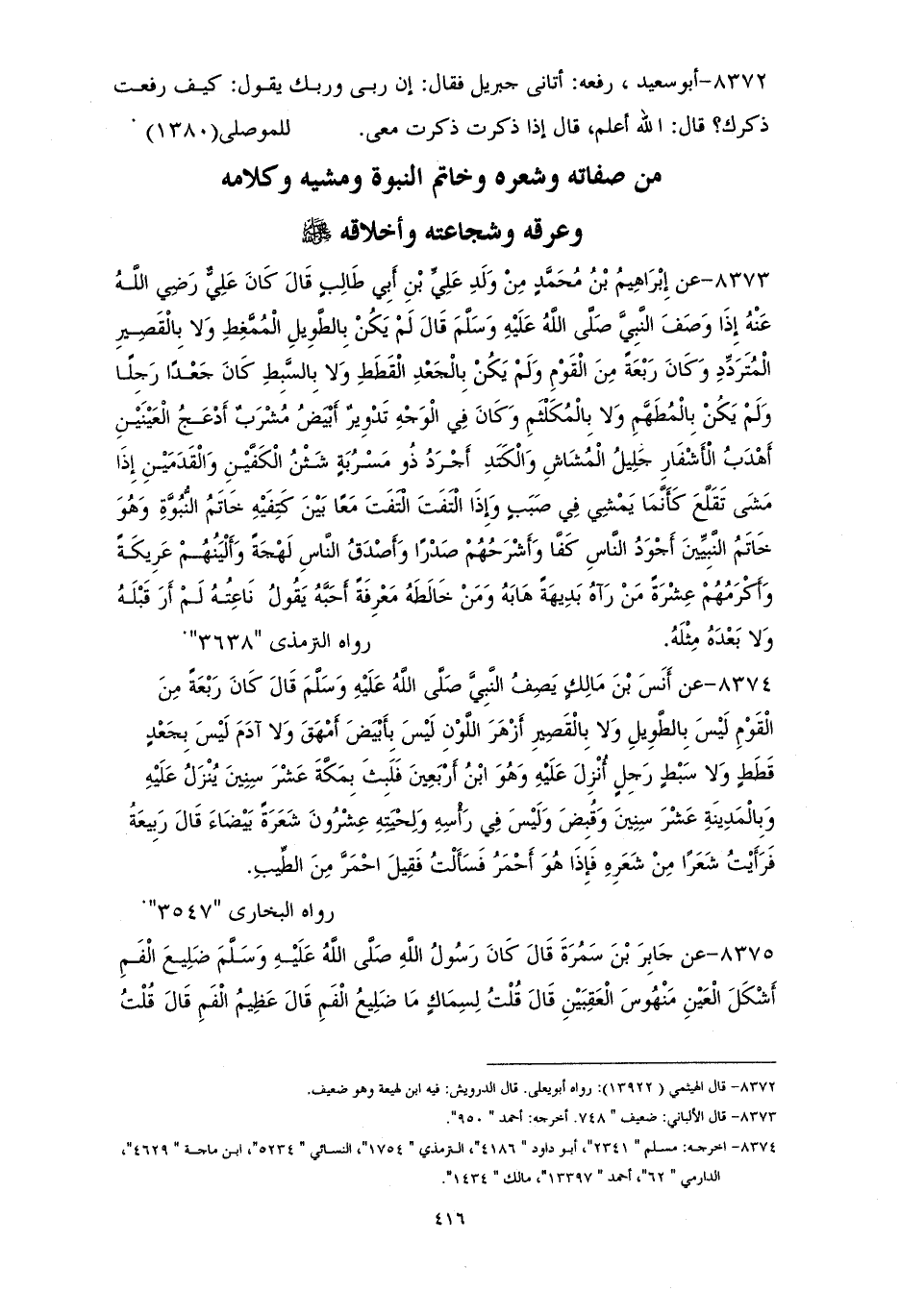 8373 - على: يصفُ النبيَّ - صلى الله عليه وسلم - قالَ لم يكن بالطويل المُمَغَّطِ (¬1)، ولا بالقصيرِ المتردد (¬2)، كان ربعةً من القوم، ولم يكن بالجعدِ القططِ (¬3)، ولا بالسبط، كان جعداً رجلاً (¬4)، ولم يكنْ بالمطهم (¬5) ولا بالمكلثم (¬6)، وكان في وجهه تدويرٌ، أبيض مشربٌ (¬7)، أدعجُ (¬8) العينين، أهدبُ (¬9) الأشفار، جليلُ المشاش والكتدِ (¬10)، أجردُ ذو مسربةٍ (¬11)، شتنُ (¬12) الكفين والقدمين، إذا مشى تقلَّع (¬13)، كأنما يمشى في صببٍ (¬14)، وإذا التفتَ التفت معًا، بين كتفيه خاتمُ النبوةِ، وهو خاتمُ النبيينَ، أجودُ الناسِ صدرًا، وأصدقُ الناسِ لهجةً، وألينهمُ عريكةً، (وأكرمهُم) (¬15) عشرةً، من رآه بديهةً هابه، ومن خالطهُ معرفةً أحبه، يقول ناعته:؛ لم أر قبله ولا بعده مثله (¬16). زاد في رواية: ضخمُ الرأس، ضخمُ الكراديسِ (¬17). للترمذي.
