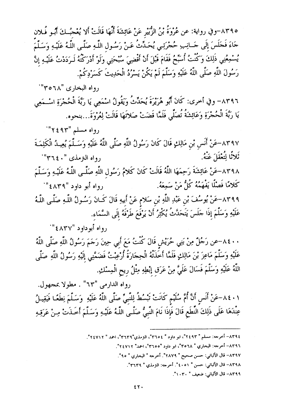 8395 - وفي رواية: قالتْ لعروةَ: ألا يعجبُكَ أبو فلانٍ؟ جاءَ فجلسَ إلى جانبِ حُجرتي يحدِّث عن النبيِّ - صلى الله عليه وسلم - يسمعني ذلكَ، وكنتُ أسبحُ، فقامَ قبل أن أقضي سبحتي، فلو أدركتُه لرددتُّ عليه أنَّ النبيَّ - صلى الله عليه وسلم - لم يكنْ يسردُ الحديثَ كسردكمُ (¬1).