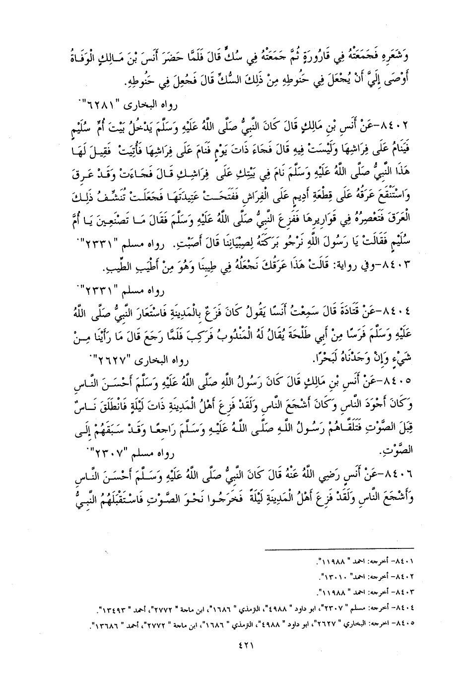 8403 - وفي أخرى: قالت: هذا عرقُكَ نجعلُه في طيبنا، وهو أطيبُ الطيبِ (¬1). للشيخين، والنسائي.