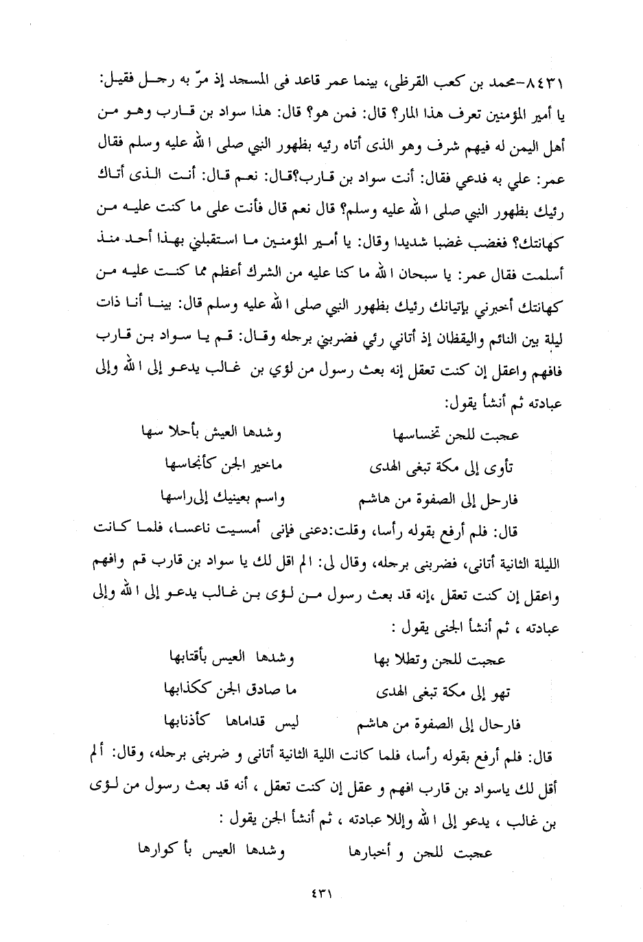 8431 - محمد بن كعب القرظي: بينما عمرُ قاعدٌ في (المسجدِ) (¬1) إذ مرَّ به رجلٌ فقيل: يا أميرَ المؤمنين، تعرفُ هذا المارَّ؟ قال: فمن هو؟ قال هذا سوادُ بنُ قاربٍ وهو من أهلِ اليمن له فيهم شرفٌ، وهو الذي أتاه رئيه بظهورِ النبيِّ - صلى الله عليه وسلم -، فقال عمرُ: علىَّ به فدعي، فقال: أنتَ سوادُ بنُ قاربٍ؟ قال: نعم، قال: أنتَ الذي أتاكَ رئيُك بظهورِ النبيِّ - صلى الله عليه وسلم -؟ قال: نعم، قال: فأنتَ على ما كنتَ عليه من كهانتكَ؟ فغضبَ غضباً شديداً، وقال: يا أمير، المؤمنين ما استقبلني بهذا أحدٌ منذُ أسلمتُ، فقال عمرُ: يا سبحانَ الله، ما كنَّا عليه من الشركِ أعظمُ مما كنتَ عليه من كهانتكَ، أخبرني بإتيانك رئيُكَ بظهور النبيِّ - صلى الله عليه وسلم - قال: بينا أنا ذات ليلةٍ بين النائم واليقظانِ، إذ أتاني رئيٌ، فضربني برجلِهِ، وقال: قُم يا سوادُ بنُ قاربٍ، فافهم واعقلْ إن كنتَ تعقلُ، إنه قد بُعثَ رسولٌ من لؤيِّ بن غالبٍ، يدعو إلى الله وإلى عبادتهِ، ثم أنشأ يقولُ: