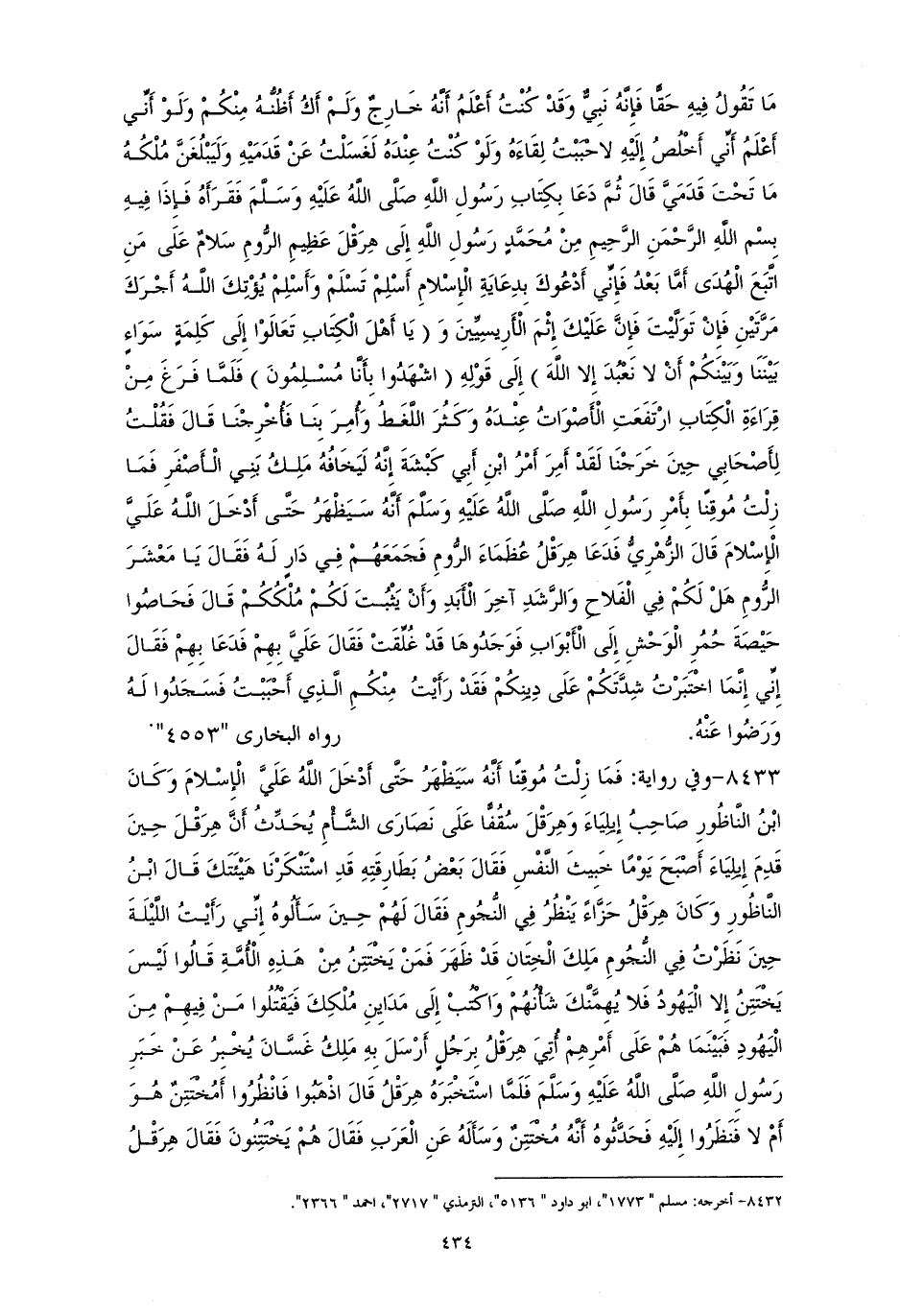 8433 - وفي رواية: فمازلتُ ذليلاً مستيقنًا بأنَّ أمرهُ سيظهرُ، حتَّى أدخلَ الله على قلبي الإِسلامَ، وأنا كارهٌ، قال وكان ابنُ الناظورِ صاحبُ إيلياءَ وهرقلُ أسقفًا على نصارى الشام يُحدِّثُ أنَّ هرقلَ حين قدم إيلياءَ أصبحَ يوماً خبيثَ النفسِ، فقال بعضُ بطارقته: قد استنكرنا هيئتُكَ، قال ابنُ الناظورِ: وكان هرقلُ حزاءً ينظرُ في النجومِ، فقال لهم حين سألوه: إنِّي رأيتُ الليلةَ حين نظرتُ في النجوم ملك الختان قد ظهرَ، فمن يختتنُ من هذه الأمةَ؟ قالوا: ليس يختتنُ فيها إلا اليهودُ، قال فلا يهمنَّك شأنُهم، واكتب إلى مدائنِ ملككَ فليقتُلوا من فيها من اليهودِ، فبينما هم على أمرهم أتى هرقلُ برجلٍ أرسلَ به ملكُ غسَّانَ، يخبرُ عن خبرِ رسولِ الله - صلى الله عليه وسلم -، فلمَّا استخبره هرقلُ قال: اذهبُوا فانظرُوا أمختتنٌ هو؟ فنظروا إليه فحدَّثُوه أنَّه مختتنٌ وسألوه عن العربِ، فقال: هُم يختتنونَ، فقال هرقلُ: