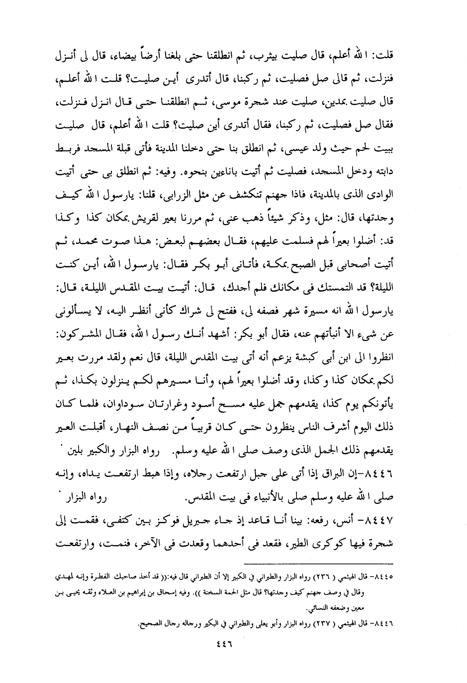8446 - وللبزار، والموصلي، والكبير نحوه، وفيه: إنَّ البراقَ إذا أتى على جبلٍ ارتفعت رجلاهُ، وإذا هبطَ ارتفعت يداهُ، وإنَّه - صلى الله عليه وسلم - صلَّى بالأنبياءِ في بيتِ المقدسِ (¬1).