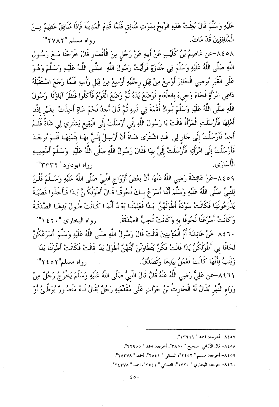 8459 - عائشة: أنَّ بعضَ أزواج النبيِّ - صلى الله عليه وسلم - قلنَ: يا رسولَ الله، أينا أسرعُ بك لُحوقاً؟ قال: ((أطولُكُنَّ يداً))، فأخذوا قصبةً يذرعونها، وكانت سودةُ أطولهن يداً، فعلمنا بعد إنما كان طولَ يدها الصدقةُ، وكانت أسرعنا لحوقاً به، وكانت تحبُ الصدقةَ (¬1). للشيخين.