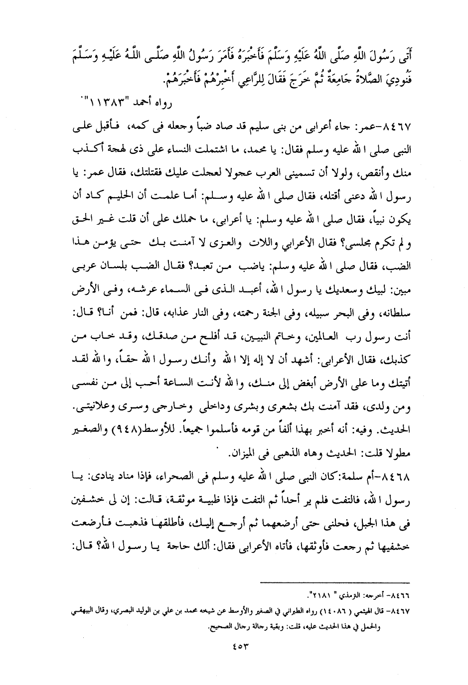 8467 - عمر: جاءَ أعرابيٌّ من بني سُليم قد صادَ ضبًا وجعله في كُمِّه، فأقبل على النبيِّ - صلى الله عليه وسلم - فقالَ: يا محمدُ ما اشتملتِ النساءُ على ذي لهجةٍ أكذبَ منك وأنقصَ ولولا أن تسميني العربُ عجولاً لعجلتُ عليك فقتلتُك، فقال عمرُ: يا رسولَ الله! دعني أقتلُه، فقالَ - صلى الله عليه وسلم -: ((أما علمتَ أنَّ الحليمَ كاد يكون نبيًا))، فقال - صلى الله عليه وسلم -: ((يا أعرابي ما حملك على أن قلت غير الحقّ ولم تُكرم مجلسي؟)) فقالَ الأعرابيُّ: واللات والعزى لا آمنتُ بك حتى يُؤمنَ هذا الضبُّ، فقال - صلى الله عليه وسلم -: ((يا ضبُ من تعبدُ؟)) فقال الضبُّ: بلسانٍ عربيِّ مبينٍ: لبيكَ وسعديكَ يا رسولَ الله! أعبدُ الذي في السماءِ عرشُه، وفي الأرضِ سلطانهُ، وفي البحر سبيلُه، وفي الجنة رحمته، وفي النارِ عذابهُ، قال: ((فمن أنا؟)) قال: أنتَ رسولُ ربِّ العالمين، وخاتمُ النبيين قد أفلح من صدَّقك، وقد خابَ من كذَّبكَ، فقال الأعرابيُّ: أشهدُ أن لا إله إلا الله وأنكَ رسولُ الله حقًا، والله لقد أتيتُك وما على الأرض أبغضُ إليَّ منك، ووالله لأنت الساعةَ أحبُّ إليَّ من نفسي ومن والدي، فقد آمنتُ بك بشعري وبشري وداخلي وخارجي وسري وعلانيتي، الحديث. وفيه أنه أخبر بهذا ألفًا من قومِه فأسلموا جميعًا. للأوسط والصغير مطولاً. قلت: الحديث وَهَّاهُ الذهبيُ في الميزانِ (¬1).