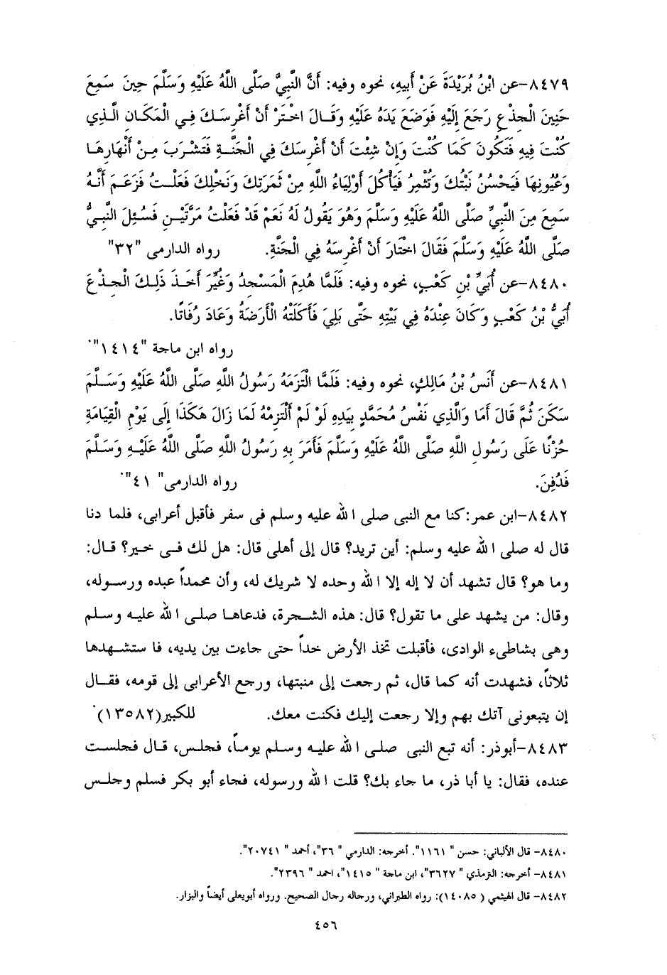 8482 - ابنُ عمرَ: كُنَّا مع النبيِّ - صلى الله عليه وسلم - في سفرٍ فأقبل أعرابيُّ، فلما دنا قالَ له - صلى الله عليه وسلم -: ((أين تريدُ؟)) قال إلى أهلي، قالَ: ((هل لك في خيرٍ؟)) قال: وما هو؟ قال: ((تشهدُ أن لا إله إلا الله وحده لا شريك له، وأن محمدًا عبدُه ورسولُه))، وقال: من يشهدُ على ما تقولُ؟ قال: ((هذه الشجرةُ))، فدعاها - صلى الله عليه وسلم - وهي بشاطئ الوادي، فأقبلت تخدُّ الأرضَ خدًا حتى جاءت بينَ يديه، فاستشهدها ثلاثًا، فشهدت أنه كما قالَ، فرجعت إلى منبتها ورجعَ الأعرابيُّ إلى قومِه، فقال: إن يتبعوني آتكَ بهم وإلا رجعتُ إليكَ فكنتُ معكَ (¬1). للكبير والموصلي والبزار.