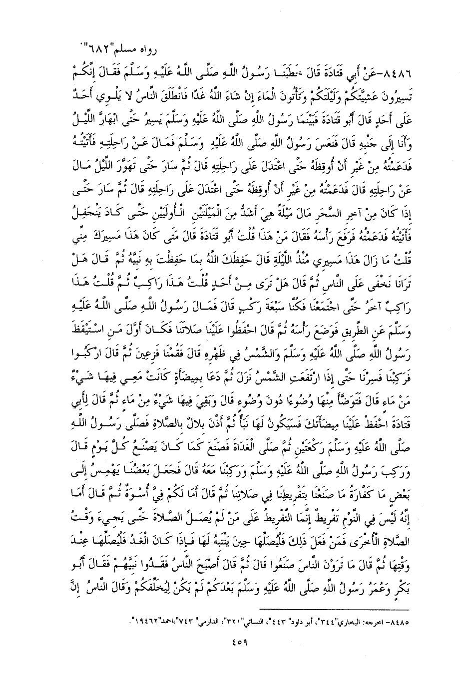 8486 - عَنْ أَبِي قَتَادَةَ، قَالَ: خَطَبَنَا رَسُولُ اللهِ صَلَّى اللهُ عَلَيْهِ وَسَلَّمَ، فَقَالَ: «إِنَّكُمْ تَسِيرُونَ عَشِيَّتَكُمْ وَلَيْلَتَكُمْ، وَتَأْتُونَ الْمَاءَ إِنْ شَاءَ اللهُ غَدًا»، فَانْطَلَقَ النَّاسُ لَا يَلْوِي أَحَدٌ عَلَى أَحَدٍ، قَالَ أَبُو قَتَادَةَ: فَبَيْنَمَا رَسُولُ اللهِ صَلَّى اللهُ عَلَيْهِ وَسَلَّمَ يَسِيرُ حَتَّى ابْهَارَّ اللَّيْلُ، وَأَنَا إِلَى جَنْبِهِ، قَالَ: فَنَعَسَ رَسُولُ اللهِ صَلَّى اللهُ عَلَيْهِ وَسَلَّمَ، فَمَالَ عَنْ رَاحِلَتِهِ، فَأَتَيْتُهُ فَدَعَمْتُهُ مِنْ غَيْرِ أَنْ أُوقِظَهُ حَتَّى اعْتَدَلَ عَلَى رَاحِلَتِهِ، قَالَ: ثُمَّ سَارَ حَتَّى تَهَوَّرَ اللَّيْلُ، مَالَ عَنْ رَاحِلَتِهِ، قَالَ: فَدَعَمْتُهُ مِنْ غَيْرِ أَنْ أُوقِظَهُ حَتَّى اعْتَدَلَ عَلَى رَاحِلَتِهِ، قَالَ: ثُمَّ سَارَ حَتَّى إِذَا كَانَ مِنْ آخِرِ السَّحَرِ، مَالَ مَيْلَةً هِيَ أَشَدُّ مِنَ الْمَيْلَتَيْنِ الْأُولَيَيْنِ، حَتَّى كَادَ يَنْجَفِلُ، فَأَتَيْتُهُ فَدَعَمْتُهُ، فَرَفَعَ رَأْسَهُ، فَقَالَ: «مَنْ هَذَا؟» قُلْتُ: أَبُو قَتَادَةَ، قَالَ: «مَتَى كَانَ هَذَا مَسِيرَكَ مِنِّي؟» قُلْتُ: مَا زَالَ هَذَا مَسِيرِي مُنْذُ اللَّيْلَةِ، قَالَ: «حَفِظَكَ اللهُ بِمَا حَفِظْتَ بِهِ نَبِيَّهُ»، ثُمَّ قَالَ: «هَلْ تَرَانَا نَخْفَى عَلَى النَّاسِ؟»، ثُمَّ قَالَ: «هَلْ تَرَى مِنْ أَحَدٍ؟» قُلْتُ: هَذَا رَاكِبٌ، ثُمَّ قُلْتُ: هَذَا رَاكِبٌ آخَرُ، حَتَّى اجْتَمَعْنَا فَكُنَّا سَبْعَةَ رَكْبٍ، قَالَ: فَمَالَ رَسُولُ اللهِ صَلَّى اللهُ عَلَيْهِ وَسَلَّمَ عَنِ الطَّرِيقِ، فَوَضَعَ رَأْسَهُ، ثُمَّ قَالَ: «احْفَظُوا عَلَيْنَا صَلَاتَنَا»، فَكَانَ أَوَّلَ مَنِ اسْتَيْقَظَ رَسُولُ اللهِ صَلَّى اللهُ عَلَيْهِ وَسَلَّمَ وَالشَّمْسُ فِي ظَهْرِهِ، قَالَ: فَقُمْنَا فَزِعِينَ، ثُمَّ قَالَ: «ارْكَبُوا»، فَرَكِبْنَا فَسِرْنَا حَتَّى إِذَا ارْتَفَعَتِ الشَّمْسُ نَزَلَ، ثُمَّ دَعَا بِمِيضَأَةٍ كَانَتْ مَعِي فِيهَا شَيْءٌ مِنْ مَاءٍ، قَالَ: فَتَوَضَّأَ مِنْهَا وُضُوءًا دُونَ وُضُوءٍ، قَالَ: وَبَقِيَ فِيهَا شَيْءٌ مَنْ مَاءٍ، ثُمَّ قَالَ لِأَبِي قَتَادَةَ: «احْفَظْ عَلَيْنَا مِيضَأَتَكَ، فَسَيَكُونُ لَهَا نَبَأٌ»، ثُمَّ أَذَّنَ بِلَالٌ بِالصَّلَاةِ، فَصَلَّى رَسُولُ اللهِ صَلَّى اللهُ عَلَيْهِ وَسَلَّمَ رَكْعَتَيْنِ، ثُمَّ صَلَّى الْغَدَاةَ، فَصَنَعَ كَمَا كَانَ يَصْنَعُ كُلَّ يَوْمٍ، قَالَ: وَرَكِبَ رَسُولُ اللهِ صَلَّى اللهُ عَلَيْهِ وَسَلَّمَ وَرَكِبْنَا مَعَهُ، قَالَ: فَجَعَلَ بَعْضُنَا يَهْمِسُ إِلَى بَعْضٍ مَا كَفَّارَةُ مَا صَنَعْنَا بِتَفْرِيطِنَا فِي صَلَاتِنَا؟ ثُمَّ قَالَ: «أَمَا لَكُمْ فِيَّ أُسْوَةٌ»، ثُمَّ قَالَ: «أَمَا إِنَّهُ لَيْسَ فِيَّ النَّوْمِ تَفْرِيطٌ، إِنَّمَا التَّفْرِيطُ عَلَى مَنْ لَمْ يُصَلِّ الصَّلَاةَ حَتَّى يَجِيءَ وَقْتُ الصَّلَاةَ الْأُخْرَى، فَمَنْ فَعَلَ ذَلِكَ فَلْيُصَلِّهَا حِينَ يَنْتَبِهُ لَهَا، فَإِذَا كَانَ الْغَدُ فَلْيُصَلِّهَا عِنْدَ وَقْتِهَا»، ثُمَّ قَالَ: «مَا تَرَوْنَ النَّاسَ صَنَعُوا؟» قَالَ: ثُمَّ قَالَ: «أَصْبَحَ النَّاسُ فَقَدُوا نَبِيَّهُمْ»، فَقَالَ أَبُو بَكْرٍ، وَعُمَرُ: رَسُولُ اللهِ صَلَّى اللهُ عَلَيْهِ وَسَلَّمَ بَعْدَكُمْ، لَمْ يَكُنْ لِيُخَلِّفَكُمْ، وَقَالَ النَّاسُ: إِنَّ -[460]- رَسُولَ اللهِ صَلَّى اللهُ عَلَيْهِ وَسَلَّمَ بَيْنَ أَيْدِيكُمْ، فَإِنْ يُطِيعُوا أَبَا بَكْرٍ، وَعُمَرَ يَرْشُدُوا، قَالَ: فَانْتَهَيْنَا إِلَى النَّاسِ حِينَ امْتَدَّ النَّهَارُ، وَحَمِيَ كُلُّ شَيْءٍ، وَهُمْ يَقُولُونَ: يَا رَسُولَ اللهِ هَلَكْنَا، عَطِشْنَا، فَقَالَ: «لَا هُلْكَ عَلَيْكُمْ»، ثُمَّ قَالَ: «أَطْلِقُوا لِي غُمَرِي»