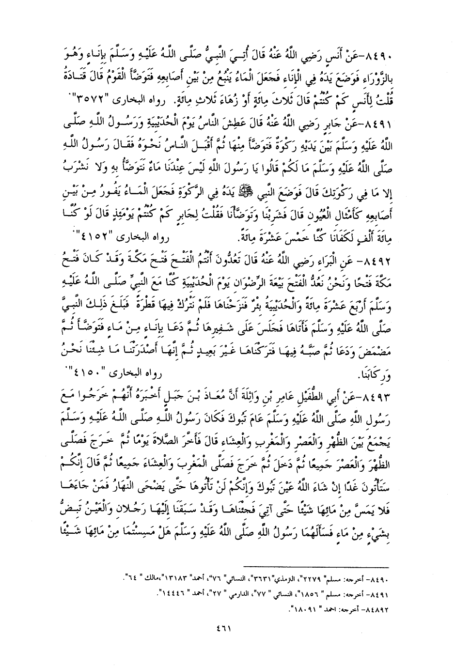 8491 - عَنْ جَابِرٍ رَضِيَ اللَّهُ عَنْهُ، قَالَ: عَطِشَ النَّاسُ يَوْمَ الحُدَيْبِيَةِ، وَرَسُولُ اللَّهِ صَلَّى اللهُ عَلَيْهِ وَسَلَّمَ بَيْنَ يَدَيْهِ رَكْوَةٌ فَتَوَضَّأَ مِنْهَا، ثُمَّ أَقْبَلَ النَّاسُ نَحْوَهُ، فَقَالَ رَسُولُ اللَّهِ صَلَّى اللهُ عَلَيْهِ وَسَلَّمَ: «مَا لَكُمْ؟» قَالُوا يَا رَسُولَ اللَّهِ: لَيْسَ عِنْدَنَا مَاءٌ نَتَوَضَّأُ بِهِ وَلاَ نَشْرَبُ، إِلَّا مَا فِي رَكْوَتِكَ، قَالَ: «فَوَضَعَ النَّبِيُّ صَلَّى اللهُ عَلَيْهِ وَسَلَّمَ يَدَهُ فِي الرَّكْوَةِ، فَجَعَلَ المَاءُ يَفُورُ مِنْ بَيْنِ أَصَابِعِهِ كَأَمْثَالِ العُيُونِ». قَالَ: فَشَرِبْنَا وَتَوَضَّأْنَا فَقُلْتُ لِجَابِرٍ: كَمْ كُنْتُمْ يَوْمَئِذٍ؟ قَالَ: لَوْ كُنَّا مِائَةَ أَلْفٍ لَكَفَانَا، كُنَّا خَمْسَ عَشْرَةَ مِائَةً