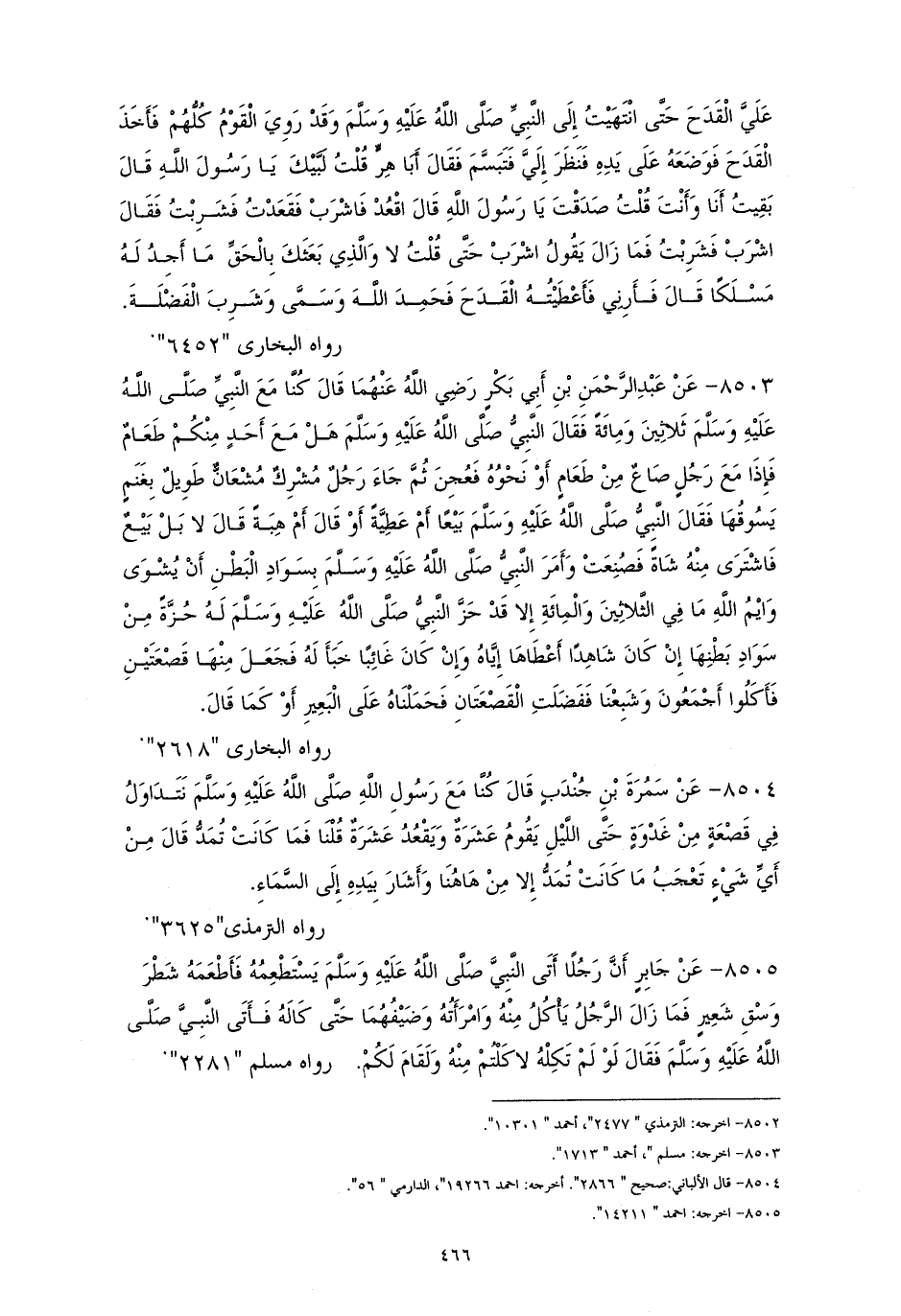 8504 - سمرةُ: كنَّا مع النبيِّ - صلى الله عليه وسلم - نتداولُ من قصعةٍ من غدوةٍ حتى الليلِ يقومُ عشرةٌ ويقعدُ عشرةٌ، فقلنا: فما كانت تمدُّ؟ قال: ((من أيِّ شيء تعجبُ، ما كانت تمدُّ إلا من ههنا، وأشار بيده إلى السماءِ)). للترمذي (¬1).