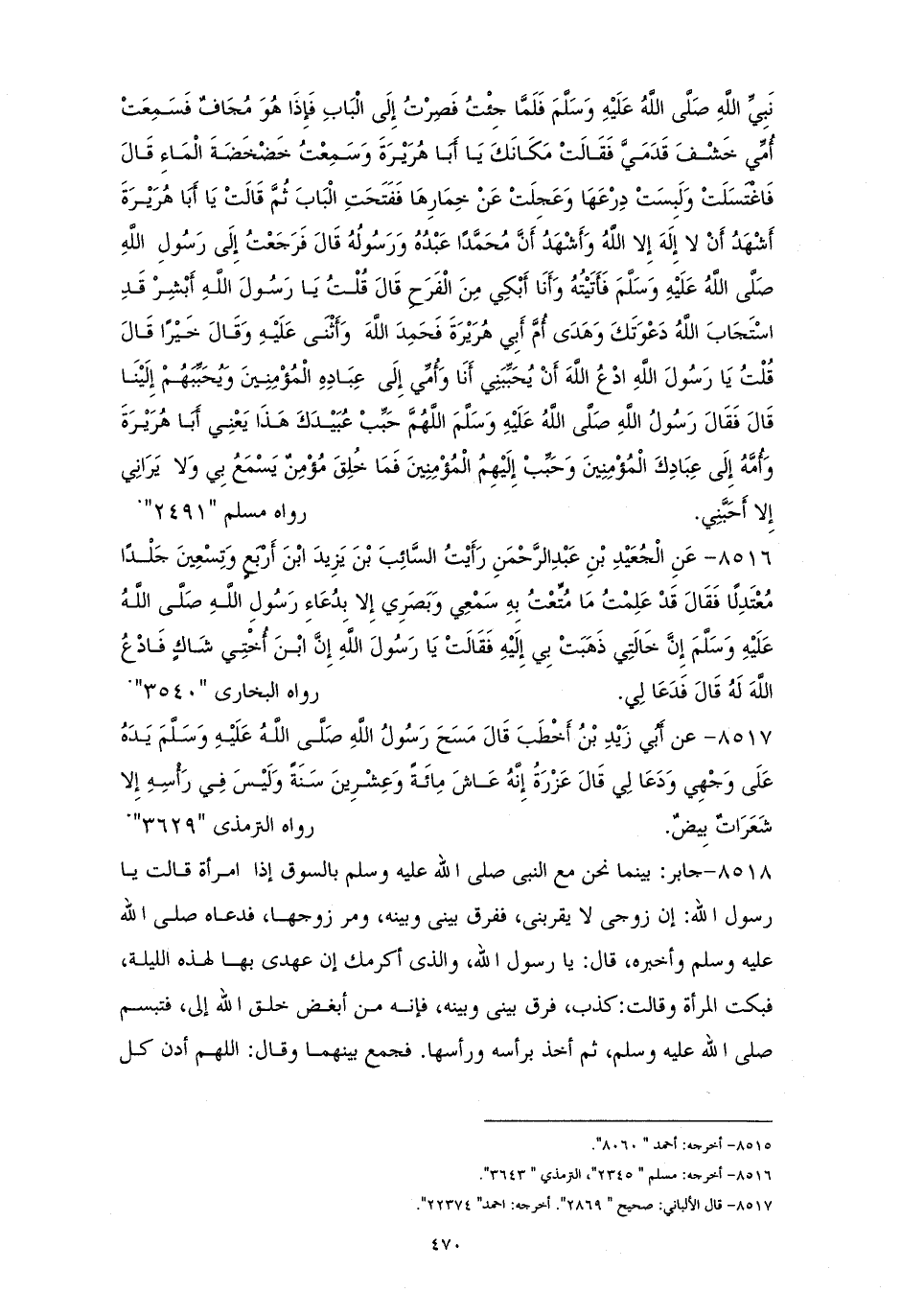 8516 - السائبُ بن يزيد: ذهبت بي خالتي إلى النبيِّ - صلى الله عليه وسلم - فقالت: يا رسولَ الله إن ابن أختي وجعٌ، فمسحَ رأسي ودعا لي بالبركةِ فتوضأ فشربت من وضوئه ثم قمتُ خلف ظهرهِ، فنظرتُ إلى خاتم النبوةِ بين كتفيه مثل زرِّ الحجلة، وقال الجعيدُ: رأيتُ السائب بن يزيدِ ابن أربعِ وتسعينَ، جلدًا معتدلاً، فقال: قد علمتُ ما متعت به سمعي وبصري إلا بدعاءِ النبيِّ - صلى الله عليه وسلم -. للشيخين والترمذي (¬1).