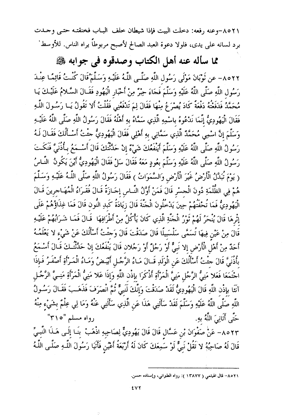 8522 - ثوبان: كنتُ قائمًا عند النبيِّ - صلى الله عليه وسلم -، فجاءَ حبرٌ من أحبارِ اليهودِ، فقالَ: السلامُ عليك يا محمدُ، فدفعته دفعةً كاد يصرعُ منها، فقال: لم تدفعني؟ فقلتُ: ألا تقولُ يا رسولَ الله؟ فقال اليهوديُّ: إنما ندعوه باسمهِ الذي سماه به أهلُهُ، فقالَ - صلى الله عليه وسلم -: ((إنَّ اسمي محمدٌ الذي سماني به أهلي))، فقالَ اليهودُّ: جئتُ أسألُكَ، فقال - صلى الله عليه وسلم -: ((أينفعكَ شيءٌ إن حدثتك؟)) قالَ أسمع بأذني، فنكث - صلى الله عليه وسلم - بعودُ معه، فقالَ: ((سل))، قالَ اليهوديُّ: أين يكونُ الناسُ يوم تُبَدَّلُ الأرضُ غير الأرض والسمواتُ؟ فقال - صلى الله عليه وسلم -: ((في الظلمة دون الجسرِ))، قال: فمن أولُ الناسِ إجازةً؟ فقالَ: ((فقراءُ المهاجرينَ))، قال اليهوديُّ: فما تحفتهم حين يدخلونَ الجنةَ؟ قالَ: ((زيادةُ كبدِ النون))، قالَ: فما غذاؤهم على أثرها؟ قالَ: ((ينحرُ لهم ثورُ الجنةِ الذي كان يأكلُ من أطرافها))، قالَ: فما شرابُهم عليه؟ قالَ: ((من عينٍ فيها تسمى سلسبيلا))، قال: صدقت، قالَ: وجئتك أسألكَ عن شيءٍ لا يعلمه أحدٌ إلا نبيٌ أو رجلٌ أو رجلانِ، قالَ: ((ينفعكَ إن حدثتك)) قال: ((أسمع بأذني))، قال: جئتُ أسألكَ عن الولدِ، قال: ((ماءُ الرجلِ أبيضٌ وماء المرأة أصفرٌ، فإذا اجتمعا فعلا منىُّ الرجل منىَّ المرأة ذكرًا بإذنِ الله وإذا علا منىُّ المرأةِ منىَّ الرجلِ أنثا بإذن الله)) قال اليهوديُّ: صدقتَ، وإنك لنبيٌ، ثم انصرفَ، فقال - صلى الله عليه وسلم -: ((لقد سألني هذا عن الذي سألني عنه ومالي علمٌ بشيءٍ منه حتى أتاني الله به)). لمسلم (¬1).